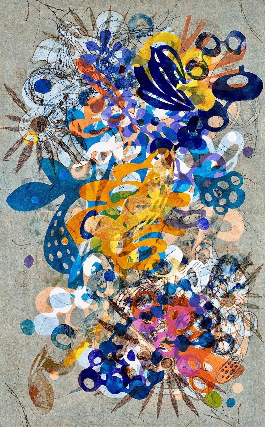 Space Gallery squeezes in two second shows for Mo’Print 2024 for Taiko Chandler and Dianne Cionni, both exceptional artists who work with Master Printmaker Sue Oehme up in Steamboat Springs. Both are free with color, arranging shapes and textures throughout the surface; Chandler’s works are like organic explosions of color, while Cionni’s delve into abstracted views of nature or geometrics, sometimes with edges that poke out of the rectangular shape of each print.