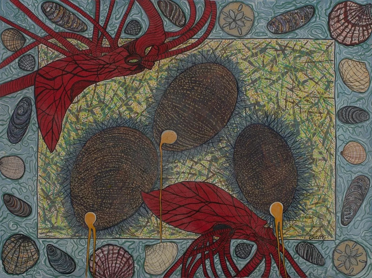 At Spark, member Sally Elliott muses on how the egg engenders an essential hopefulness while touching on the egg as a shifting cultural marker in dense, decorative gouache paintings of chicken, turkey, emu and ostrich eggs; Phillip Potter experiments with shifting versions of human perception, reframing a composition of related shapes in different colors of gouache and colored pencil to evoke different planes of emotion or being; and Kat Potter shows work in the the North Gallery.