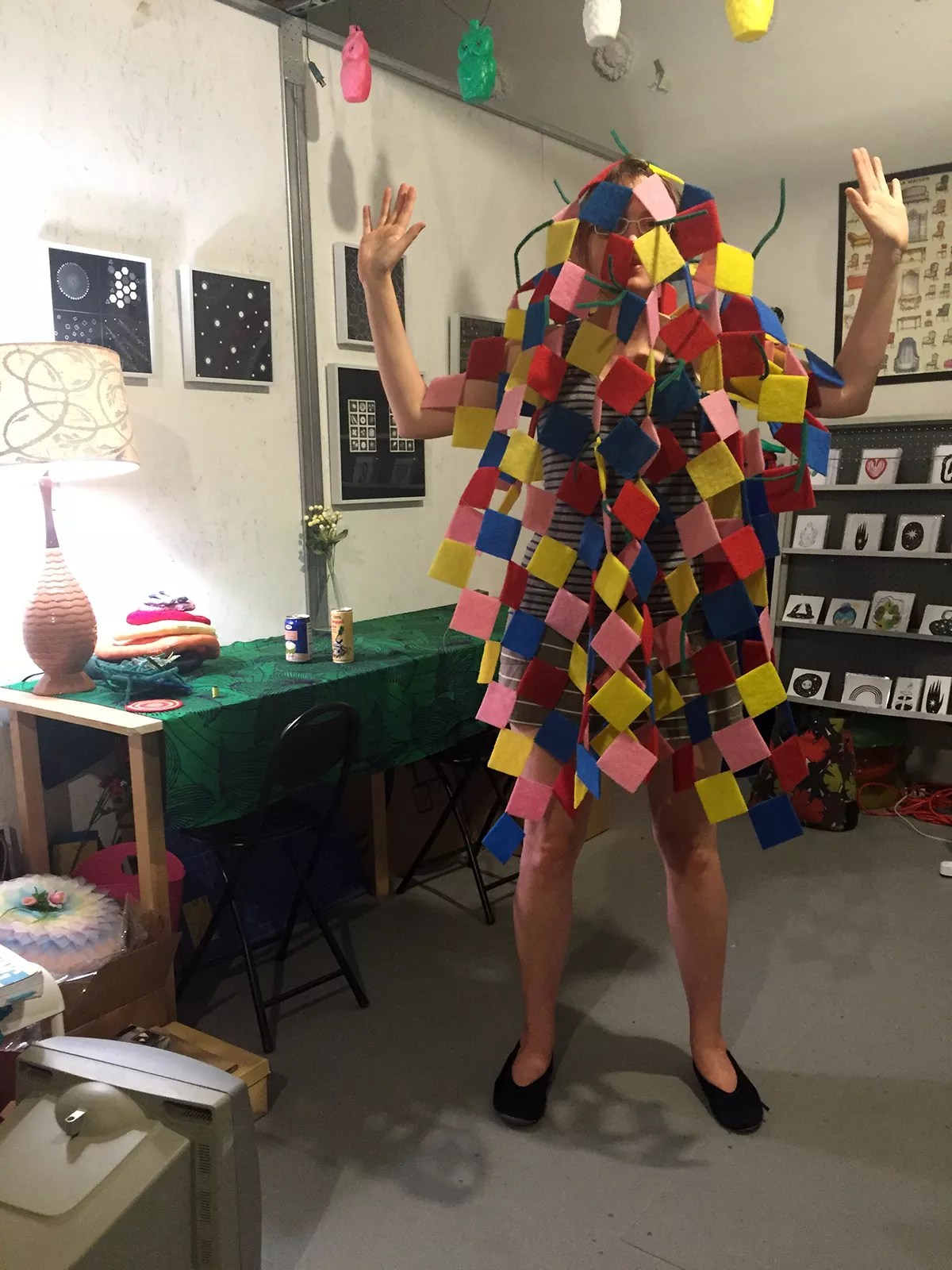 Genevieve Waller wearing one of her sponge rug sculptures, 2016.