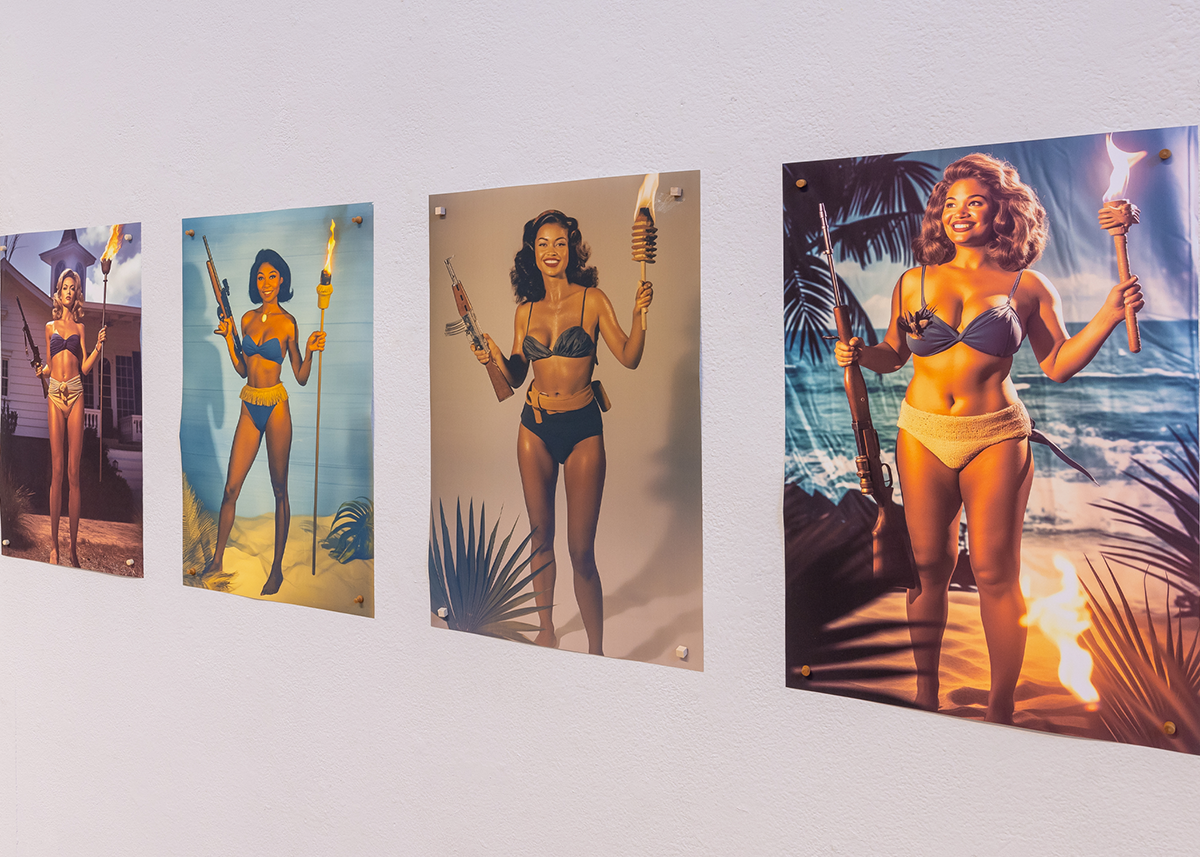 A line of AI-generated prints by Micol Hebron, for example, takes our cultural fascination with weapons out for a day at the beach. Hebron, a multi-disciplinary artist and educator, uses her work to expose sexism and gender bias in contemporary media and technology. Her “Summer Bod: Trad Wife Edition” is an uncanny set of digital portraits that display a procession of beautiful, joyful, bikini-clad women of many ethnicities, who are all carrying a tiki torch…and a semi-automatic rifle. Intrigued by the “Old Navy” aesthetics of figures such as 2020’s briefly famous, gun-toting Mark and Patricia McCloskey, and the protesters at Charlottesville’s “Unite the Right” rally in 2017, Hebron started the project by experimentally feeding prompts into Midjourney, a generative AI program.