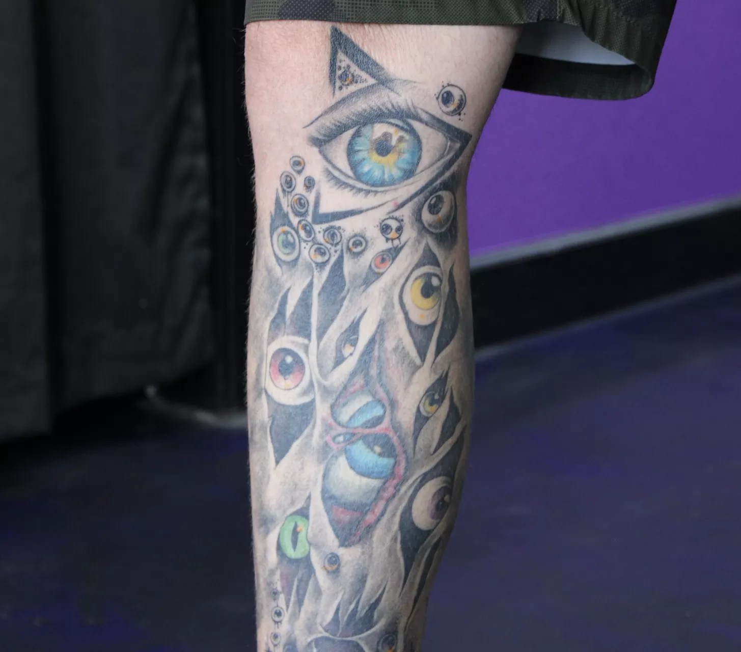 The result is a sprawling, visually striking leg sleeve packed with eyes – each uniquely styled and encased in subtle environmental clues that suggest which creature it belongs to. More than just a visual spectacle, the sleeve is grounded in personal symbolism and spiritual meaning for Minson.