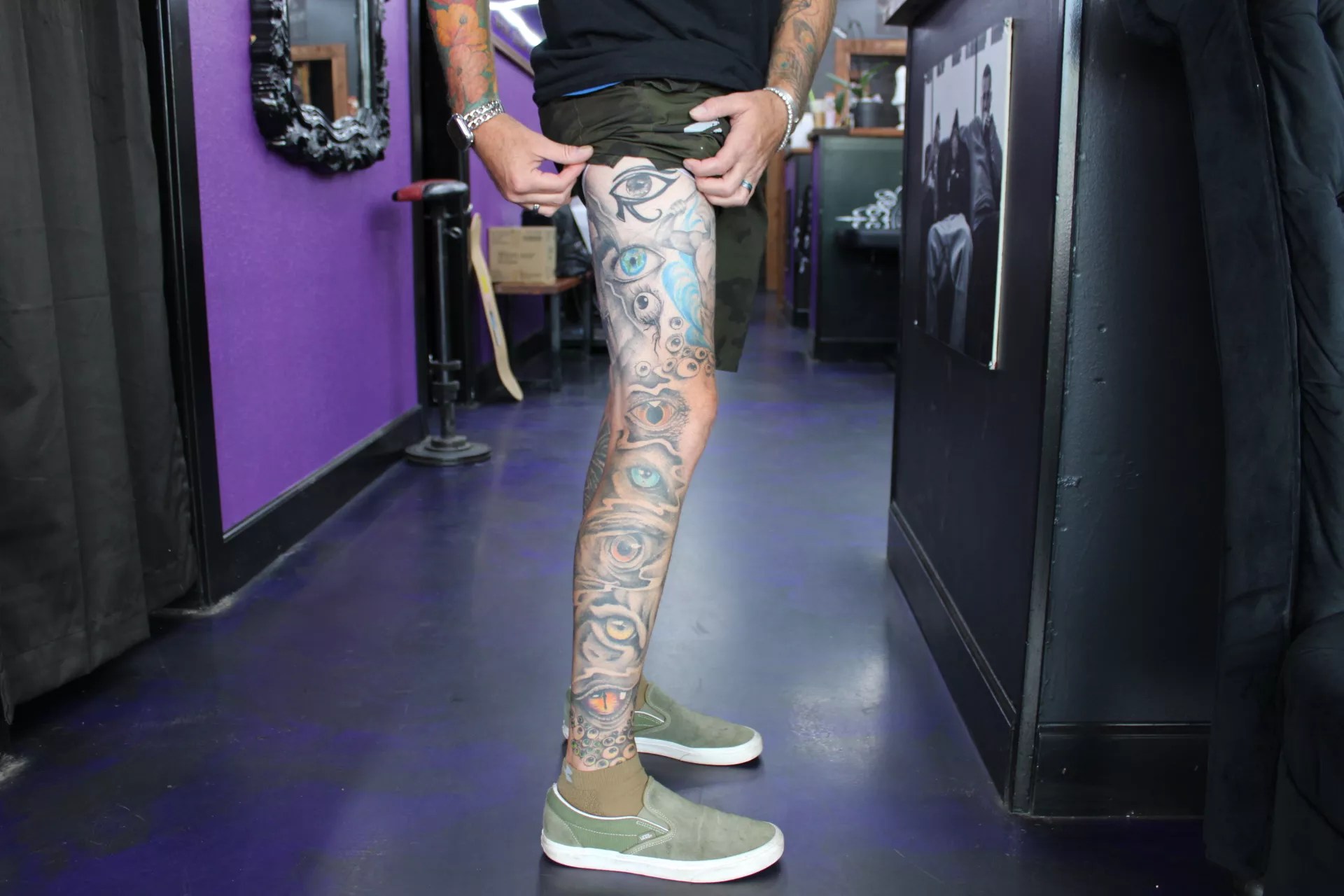“He’s a pretty open-minded tattoo collector, so he has a lot of cool, creative ideas, and that’s how we got started on the eyeball leg sleeve,” Lucero says. “Chad originally had some other tattoo on his leg, and we were trying to figure out a way to incorporate that into a sleeve. I came up with the idea for the eyeballs.”