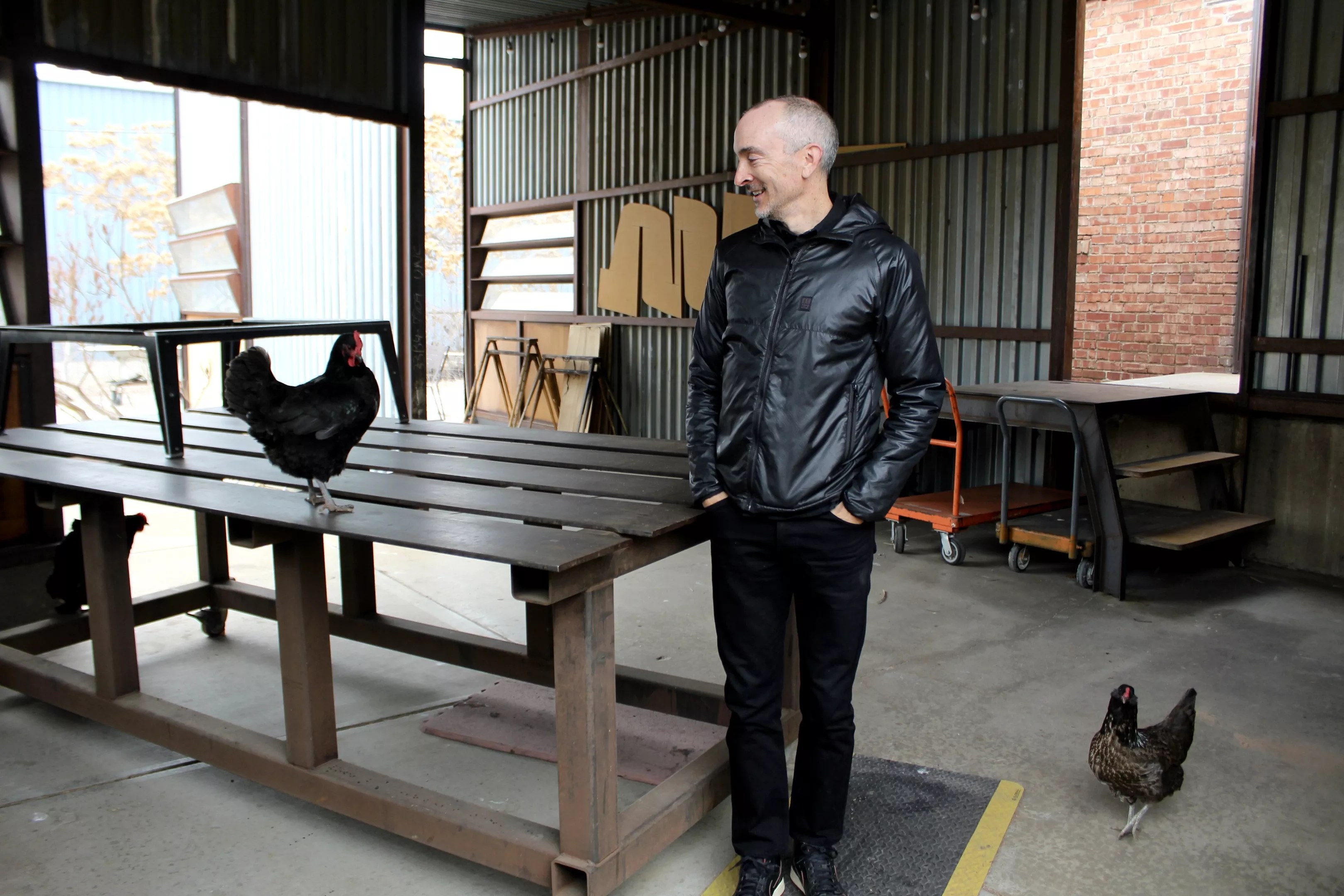 “We’re not pushing a farm agenda, we’re pushing chickens out of our workspace, constantly,” says Thornton, who co-founded furniture manufacturer DoubleButter with Larabee nearly twenty years ago. The showroom and workshop sit on a lot in Baker that is home to four chickens – Fred Savage, D’Liza, Chickadee and Watermelon – as well as multiple beehives and the occasional hawk, rabbit, fox and raccoon.