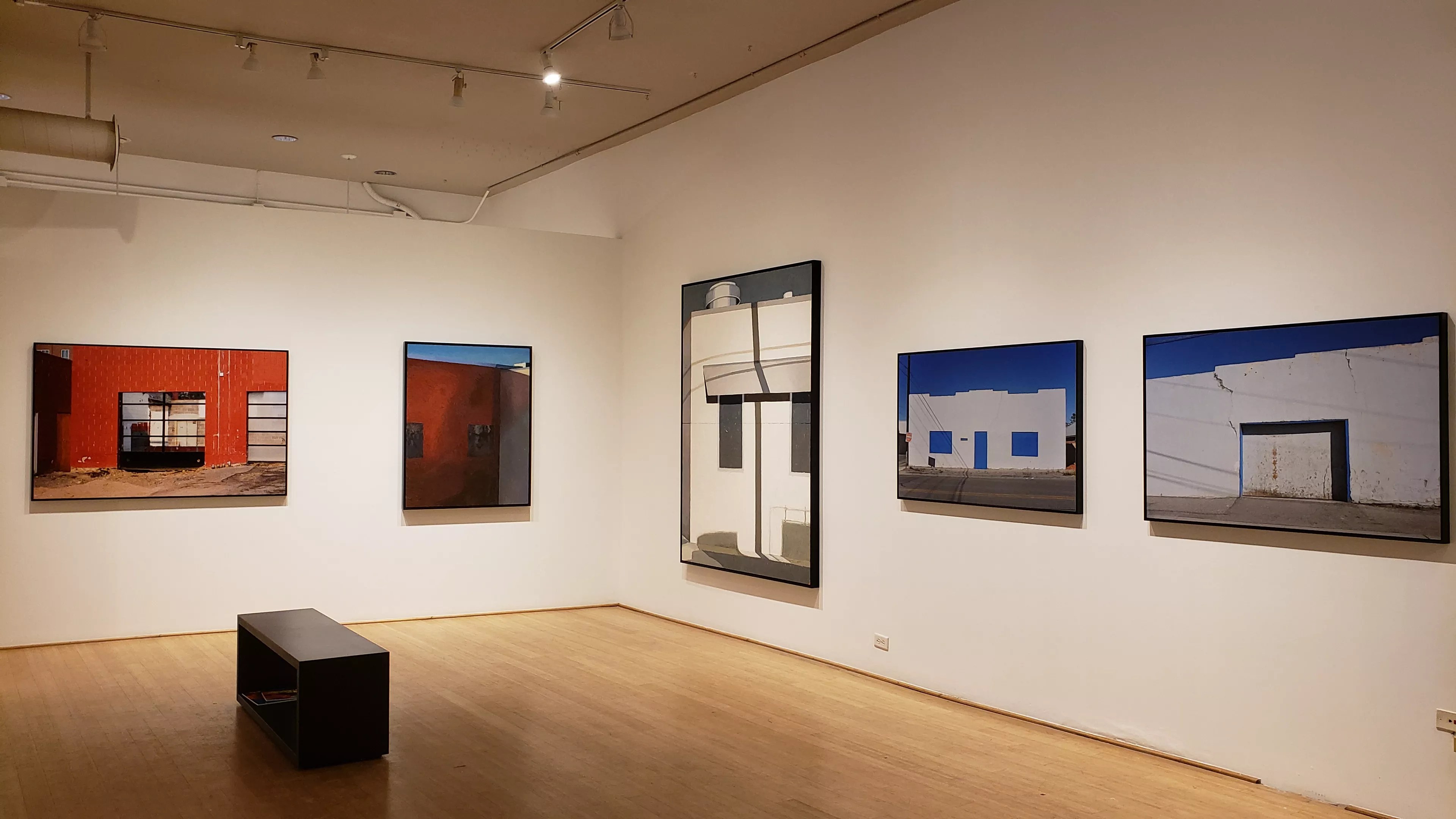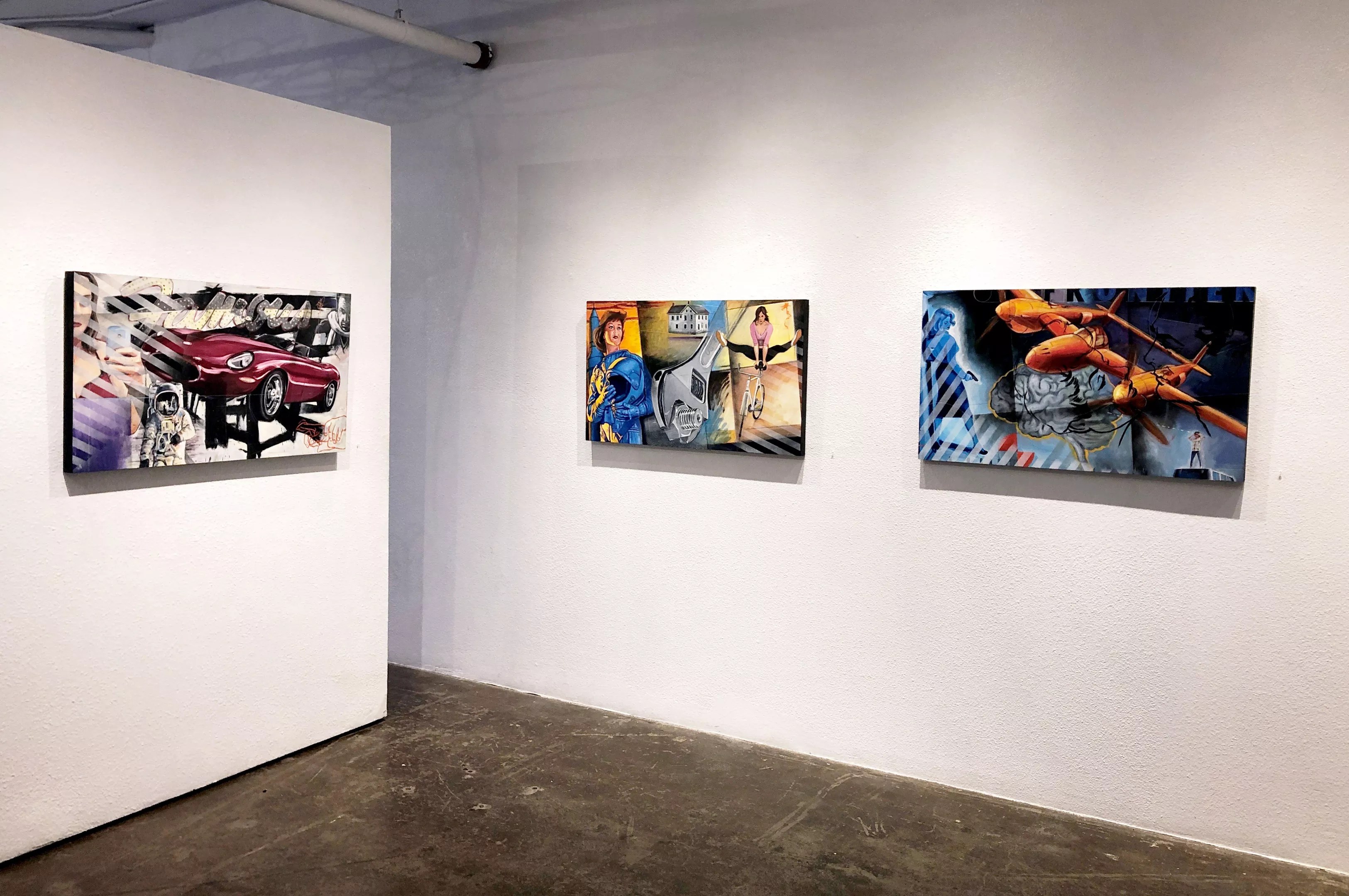 Two Sharon Feder paintings hanging on adjacent walls (center) bracketed by Dallas Parkins photos.