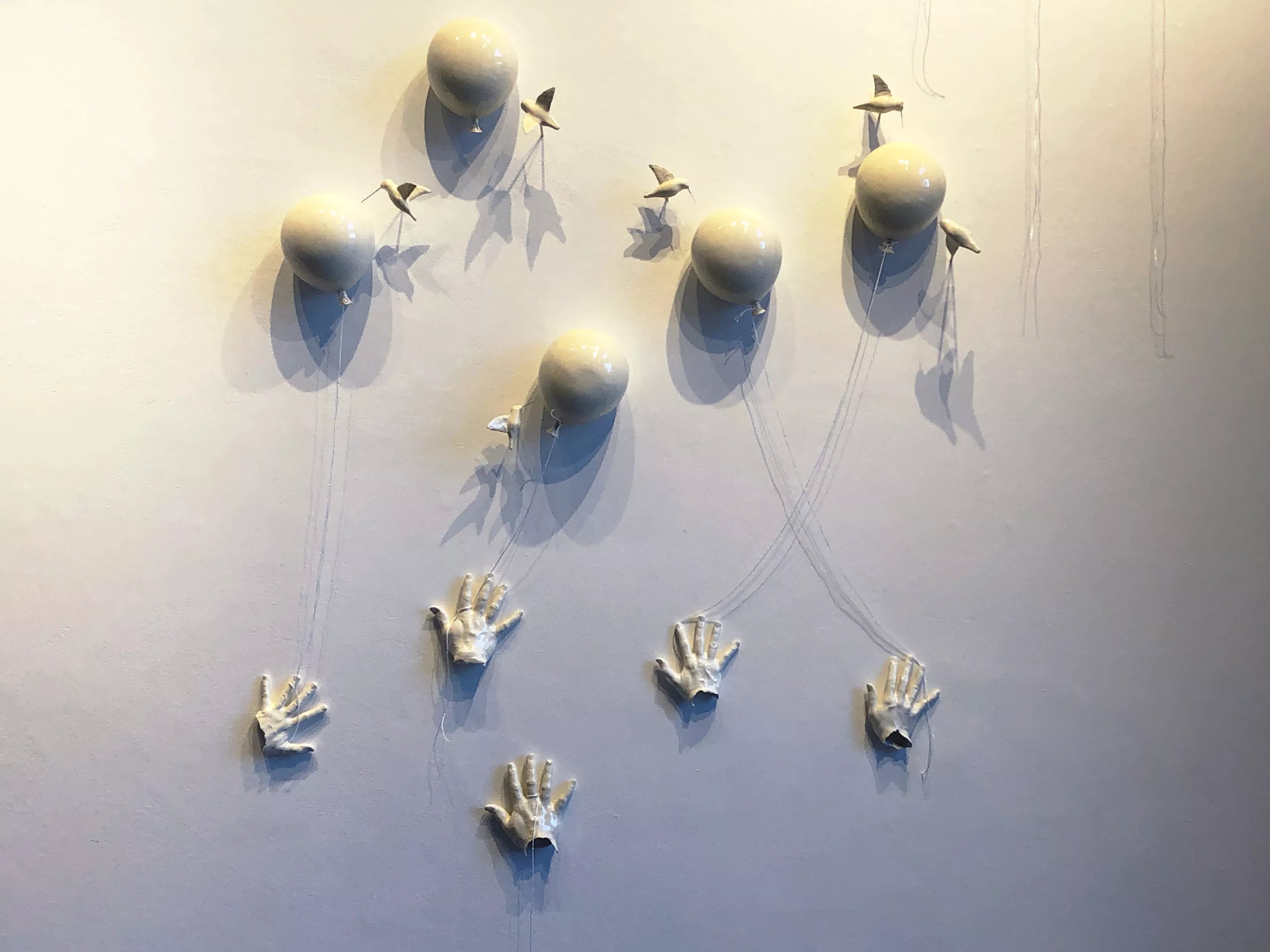 Layers of Existence is a free-for-all, with conceptual art, contemporary realism and abstraction distributed around Walker’s large, multi-part space. The show opens with wall installations by Meagen Svendsen, in which casts of slightly under-inflated balloons are the principal device. The most significant is “The Thing With Feathers,” in which the balloons, cast in white porcelain, are seen floating into the sky, their string tails hanging beneath them; below are casts of the hands of the artist and her husband and son, who presumably have let go of the balloons. Into this whimsical scene, hummingbirds are introduced, but while they add another lighthearted element, they also introduce a dark undercurrent: Instead of beaks, the birds have needles, and they are heading for the balloons.