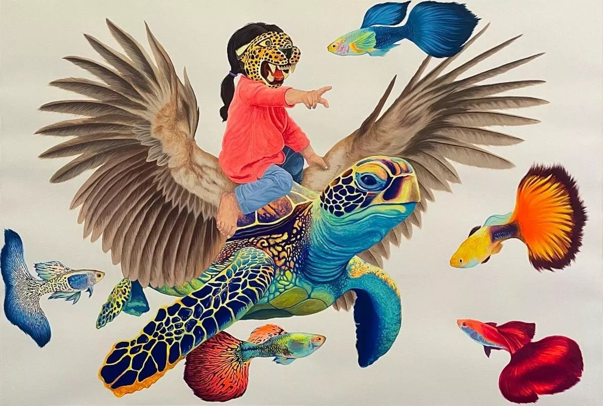 Visions West showcases two artists into 2025: June Glasson, who examines the concept of “women’s work” through iconography flavored both by higher ideals in a democratic society and female fury, and Marcos Lucero, a Mexican surrealist whose folkloric world explores the connections between animals and humans.