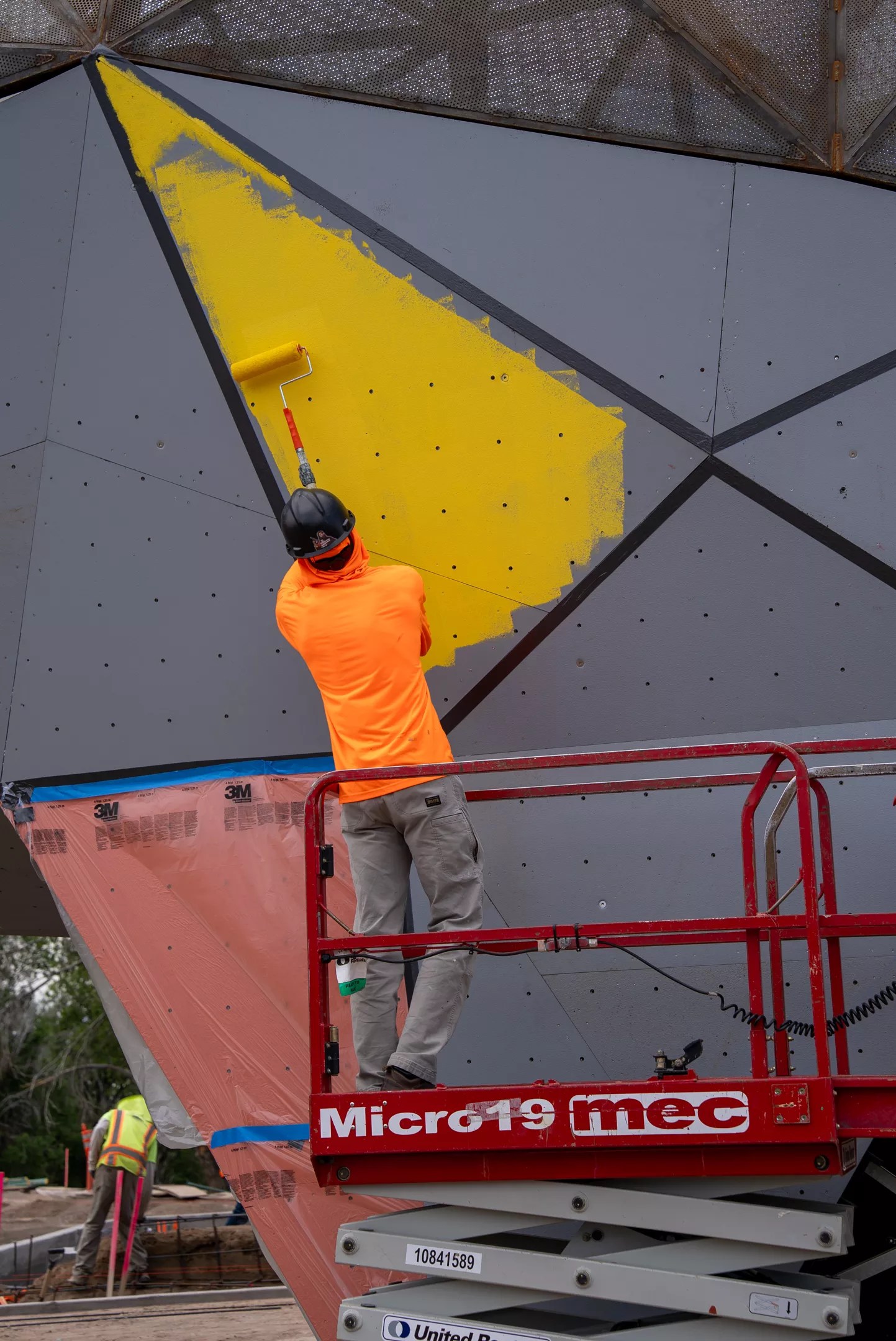 Although the rhino has been a symbol of RiNo since the art district was formed in 2005, the idea for the sculpture dates back to 2020; JunoWorks and Eldorado Walls have been working on its fabrication since late 2022. The pieces started arriving on-site in April and the sculpture is projected to be finished in June, but it won’t be accessible to climbers until early September, as the rest of the area is still under construction.