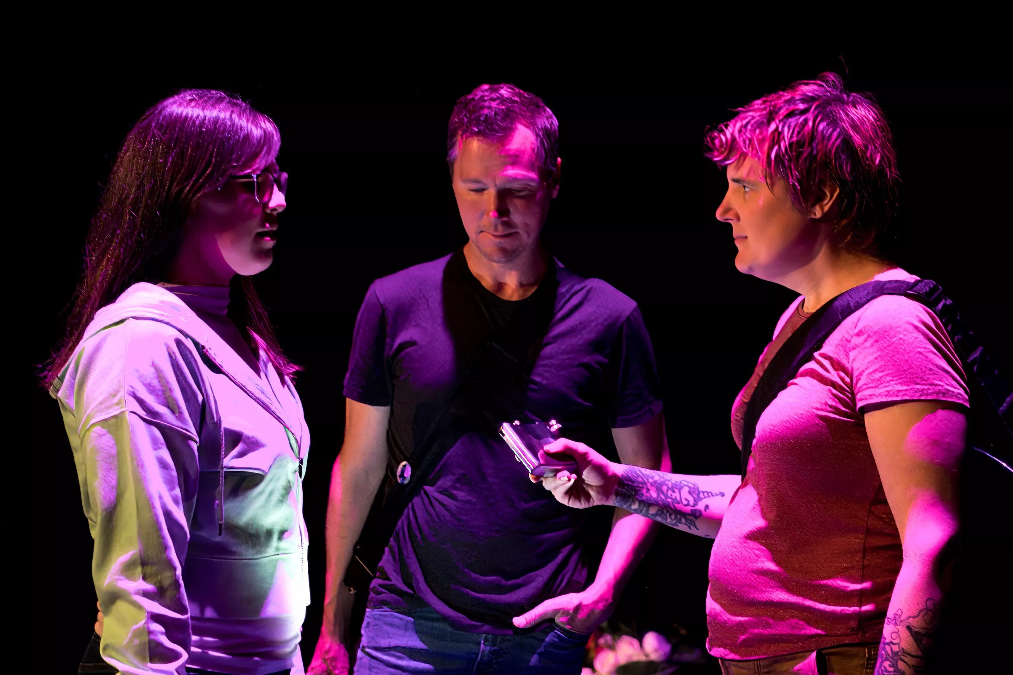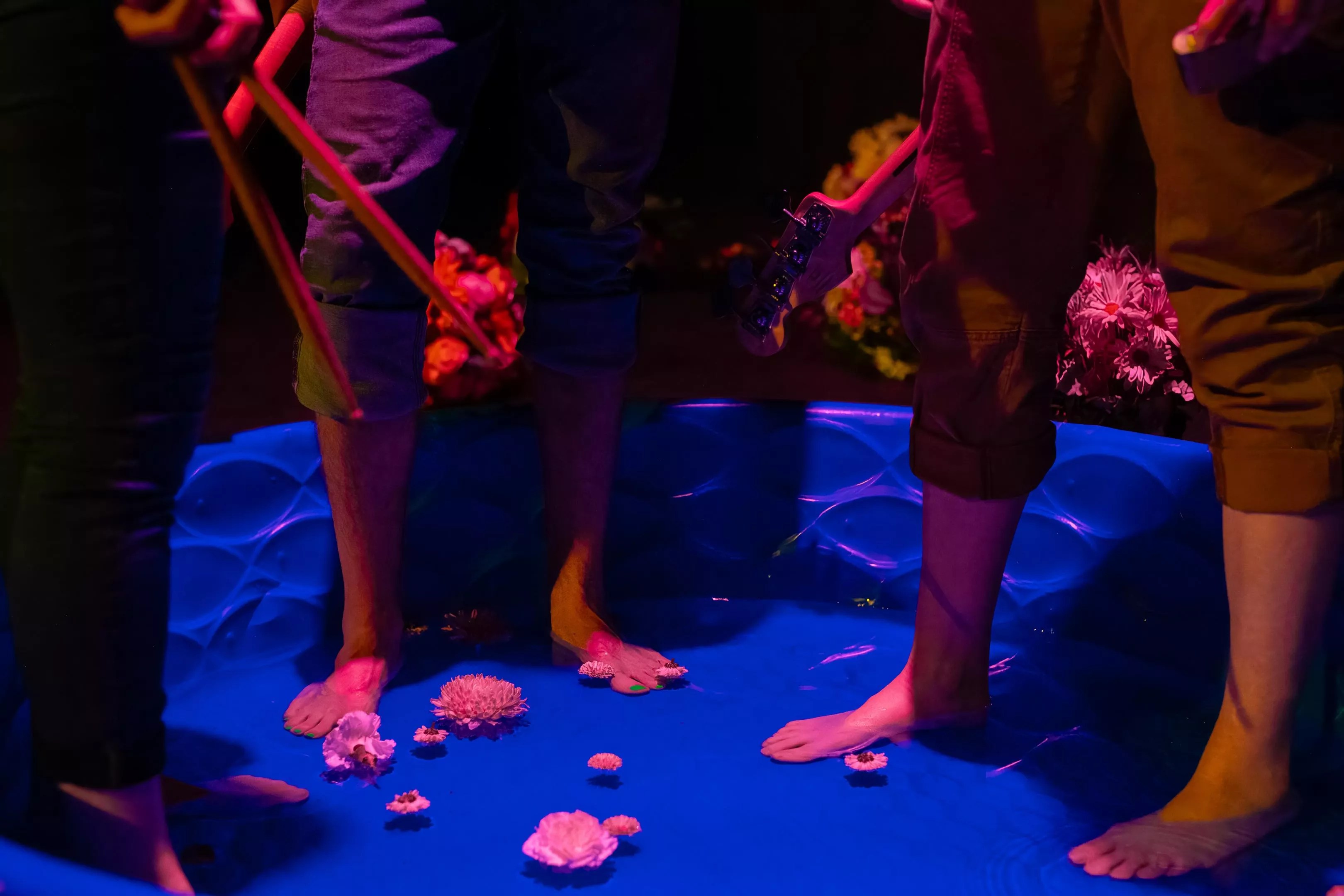 “We are setting it up as if it were a concert, even though we are in a theater,” says Julie Rada of Grapefruit Lab. “We have openers, but unlike a concert, we are being a little more deliberate about costuming and lighting. Along the way, the concert starts to unravel into this sort of extemporaneous conversation that relives old memories and explores identity. We have an old-school overhead projector that is used for telling stories, and there is a kiddie pool with water in the center of the stage – which is not a spoiler, because it is there from the moment people walk in, but it is something they must contend with.”