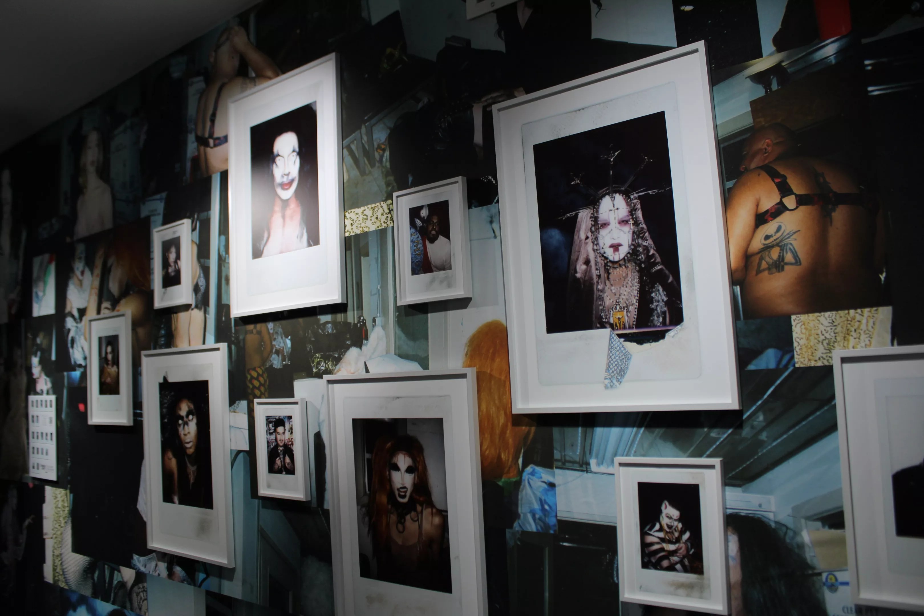 Framed in front of the collage are blown-up glamour shots that Shadow took of the performers’ completed looks on her Fuji Neo Classic Mini, an instant camera. “What Shadow does is so important for our community,” says Musk Rat, one of the performers from the event. “She’s able to capture these moments and looks that only last for one night – outfits and performances that would otherwise be created and lost forever in the passage of time.”