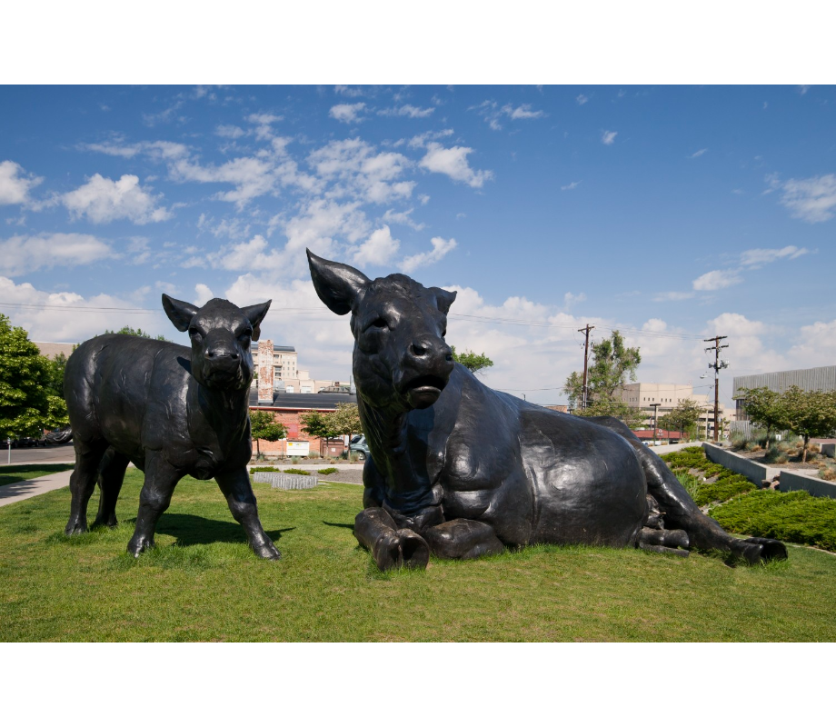 Created by Wyoming-born artist Dan Ostermiller, “Scottish Angus Cow and Calf” depicts a bronze cow resting in the grass next to her awkward, spindly-legged calf. The piece was commissioned by Colorado ranch owner Leo Hindery, who adored his Scottish Angus cows and wanted to commemorate the large, lovable animals. Hindery promised to donate the sculpture if he ever sold his property and made good on his word, gifting it to the Denver Art Museum in 2006. The work captures the body language of the cows that Ostermiller observed to create the piece, mimicking how they behaved in his presence while in their natural habitat.