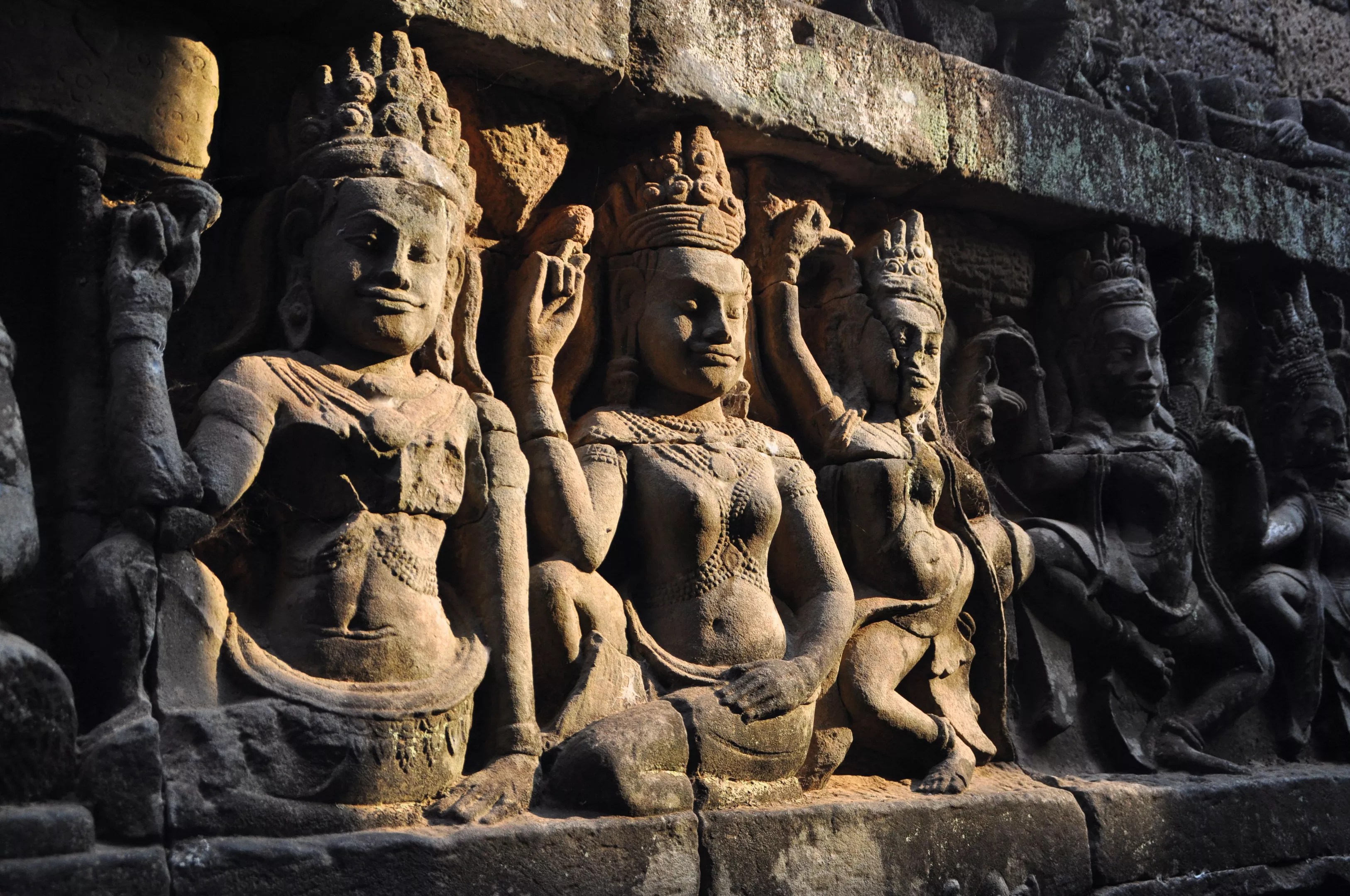These relief statues of goddesses holding fans are part of the sculpture work at the terrace of the Leper King, located in Angkor Thom.
