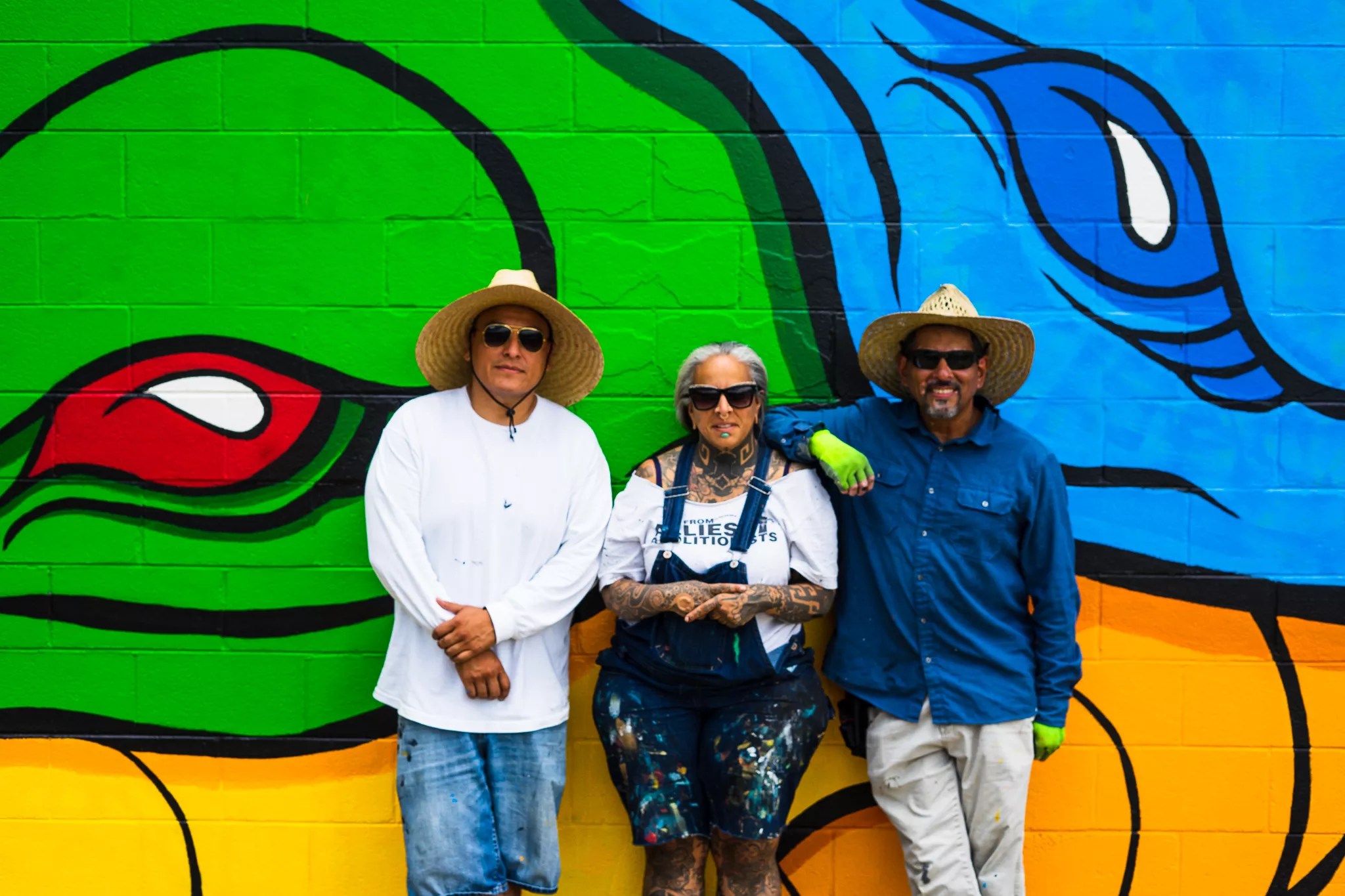 Artists Victor J. Escobedo (from left), Alicia Cardenas and Marco Antonio Garcia in front of their collaborative piece “Xipe Totec.”