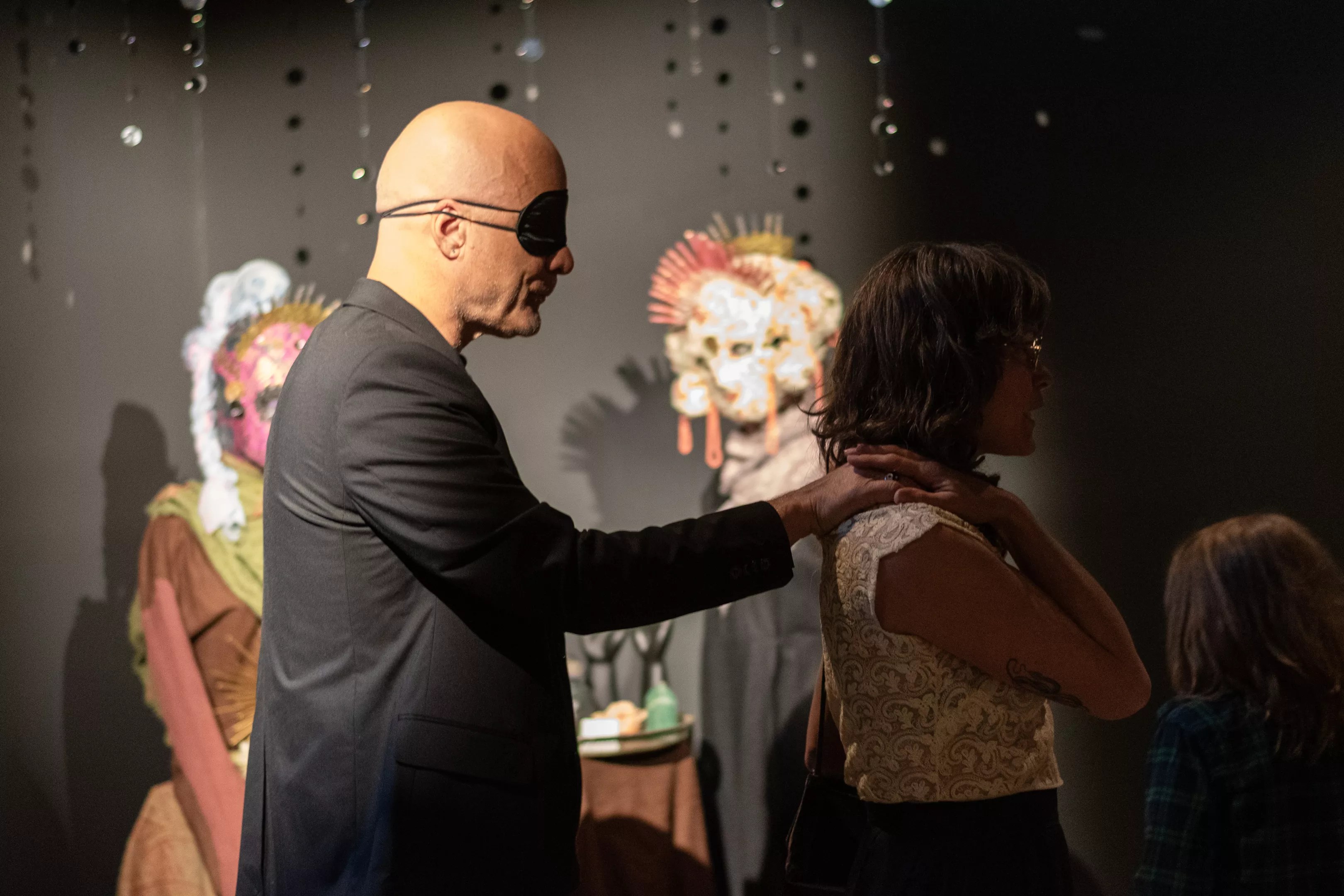 Donning the provided black blindfold (and some trust), I linked arms with chief curator Esther Hernandez, who guided me through the space. As we stopped in front of select works, Hernandez prompted me to note what I was feeling.