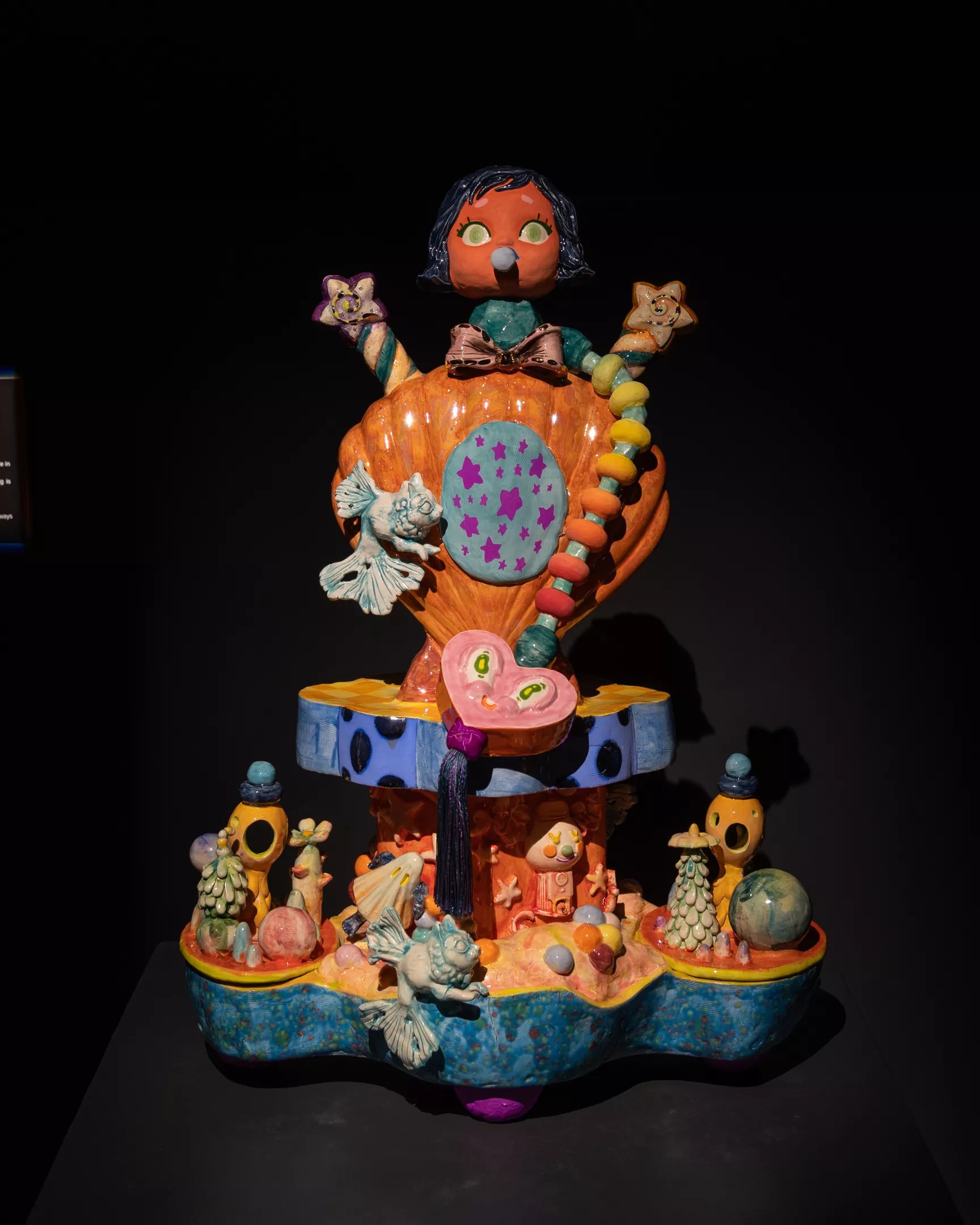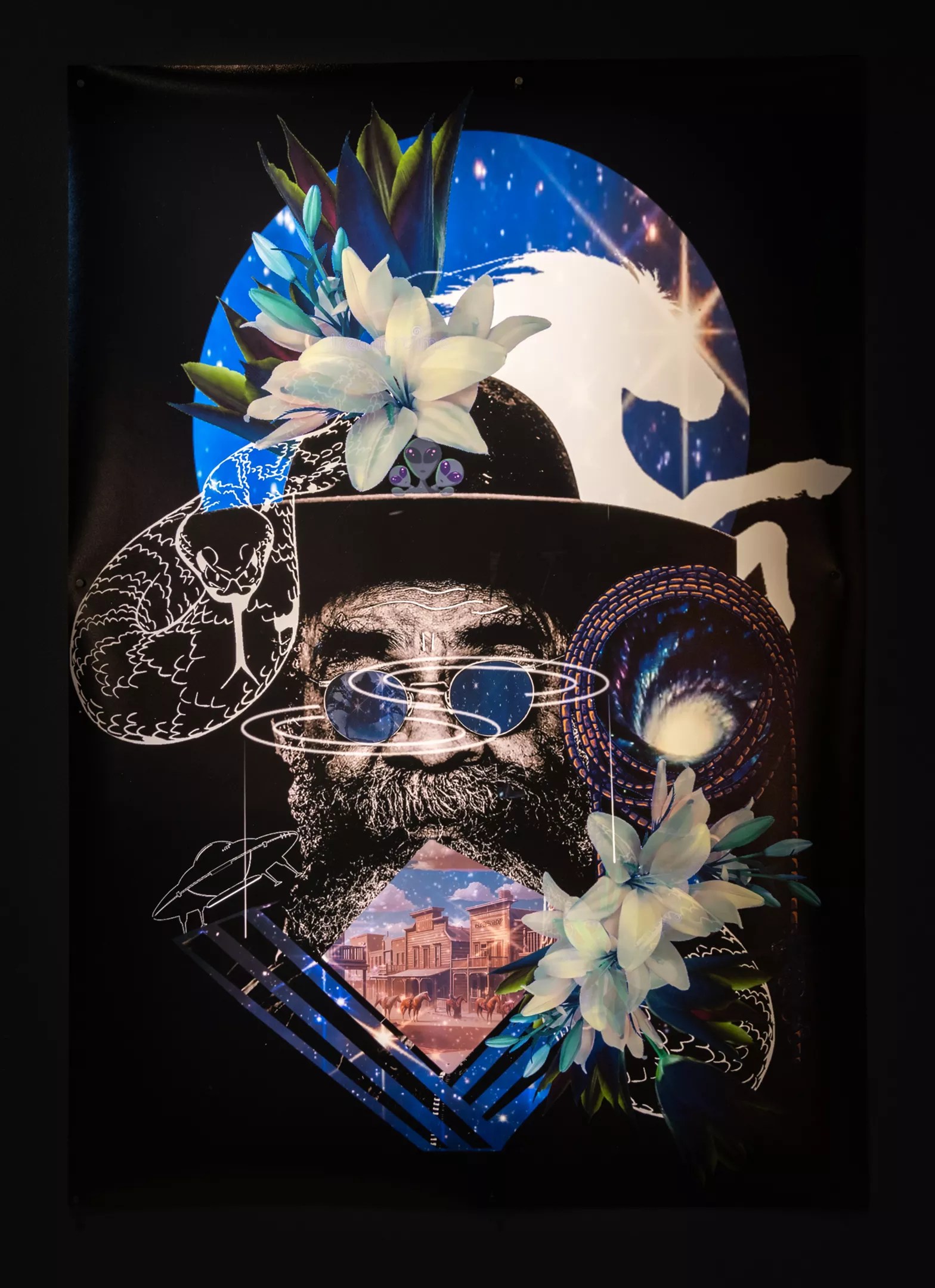 After reflecting on “Space Cowboy,” I wandered the gallery again, this time with open eyes. Seeing the full scope of the work revealed a striking diversity in both medium and tone: ceramic totems, digital collages, beaded masks, hand-drawn glyphs and even a ceremonial weighted blanket.