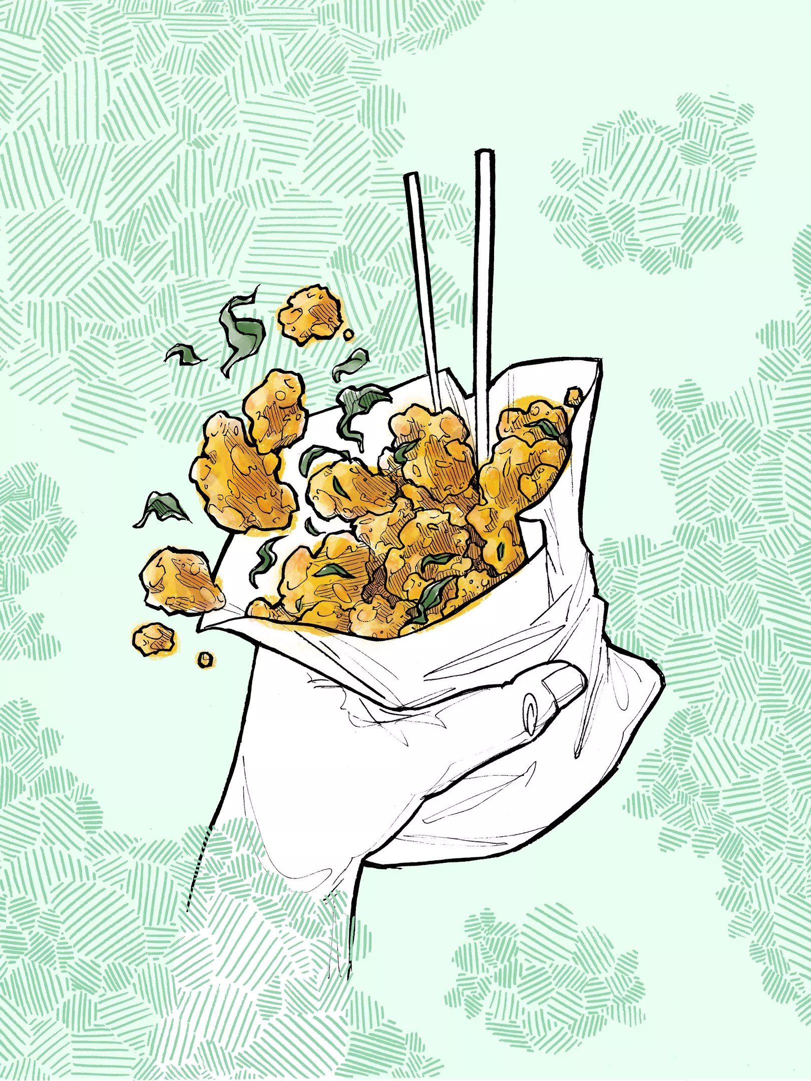 This illustration, called “Salt and Pepper Chicken,” comes from a series in Slant’d‘s first issue about a shared cultural touchstone in Taiwan and Tennessee.