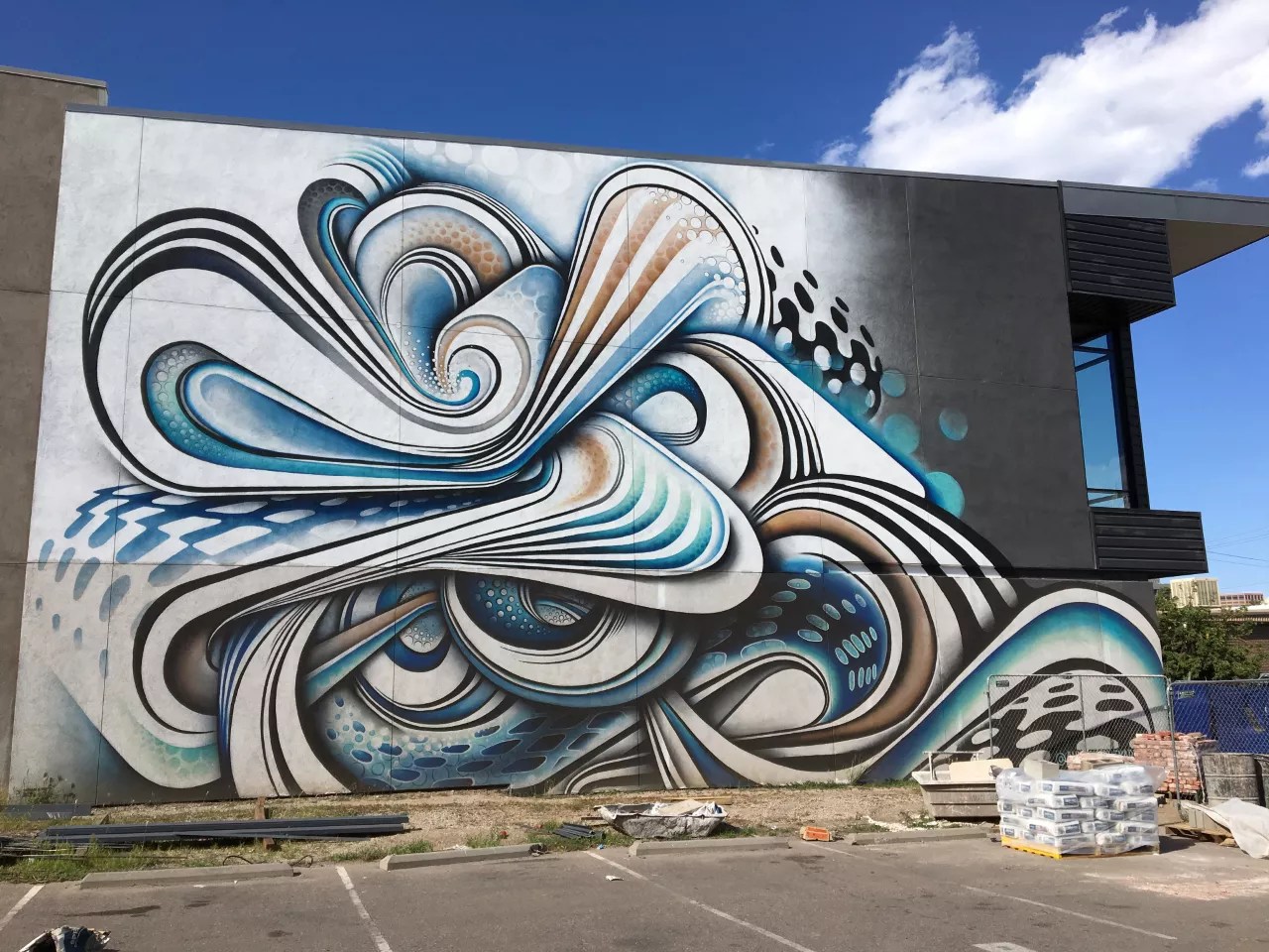 A block north of the Sweatshop/CVA murals is a striking abstract on the south-facing wall of the Colorado Ballet’s Armstrong Center for Dance, painted in 2017 by Denver artist Anna Charney. There are Charney pieces all around the city, done in a signature style that makes it easy to identify her work. Her non-objective compositions of swooping forms have an op-art character, since the flowing shapes seem to weave in and out of one another in an illusion of three-dimensional space. Charney also adds three-dimensionality to the forms themselves through the use of repeated shapes laid in patterns that refer directly to dot printing and add body to the shapes. While completely non-objective, her compositions are realistically rendered, and the wonderful two-story mural on the Center for Dance is a superb example of her oeuvre. Done in blues, sand, black and white, it stands out emphatically from the charcoal-gray ground of the building, and it’s gigantic, coming into view a half a block away. Though the bottom is currently blocked by piles of construction materials being used on the restoration of the nearby Amick building, Charney’s mural still holds its own.