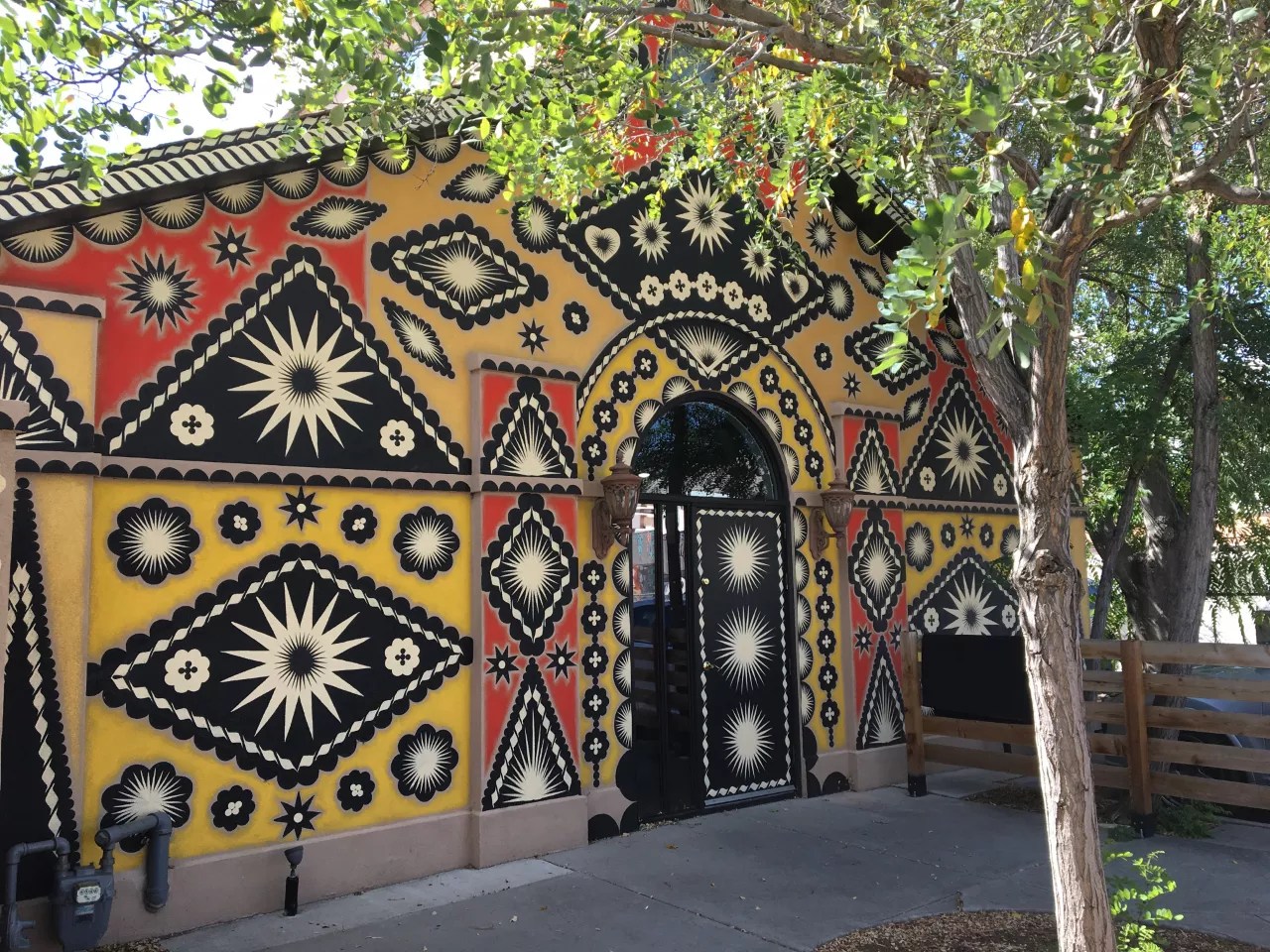 This wraparound set of murals painted in 2017 by Los Angeles muralist Shrine (aka Brent Allen Spears) on Sweatshop, a dance academy, rival the Vyal One mural in RiNo in size and ambition. Taking his signature approach to the north-facing wall of the main building and an adjacent east-facing wall of an alley building, Shrine defined the structural elements using grounds of mustardy yellow and terracotta red. He then applied innumerable small elements in black and white, arranging them hieratically so that they cleverly reinforce and redefine the existing piers, rooflines, doors and windows. The repeated shapes include simple stars, flowers and short lines that suggest braids when strung together; these shapes follow the building’s elements or are set in medallions that float in the middle of the defined sections of the walls. It’s remarkable how, just using paint, Shrine was able to transform the parking lot into a formal forecourt, a goal helped along by the charming handmade fence. Shrine has created more than fifty murals around the world; he considers mural painting a means of spiritual healing, and uses it as a way to transform what is ugly into something that’s beautiful. And that’s clearly what he’s done here.