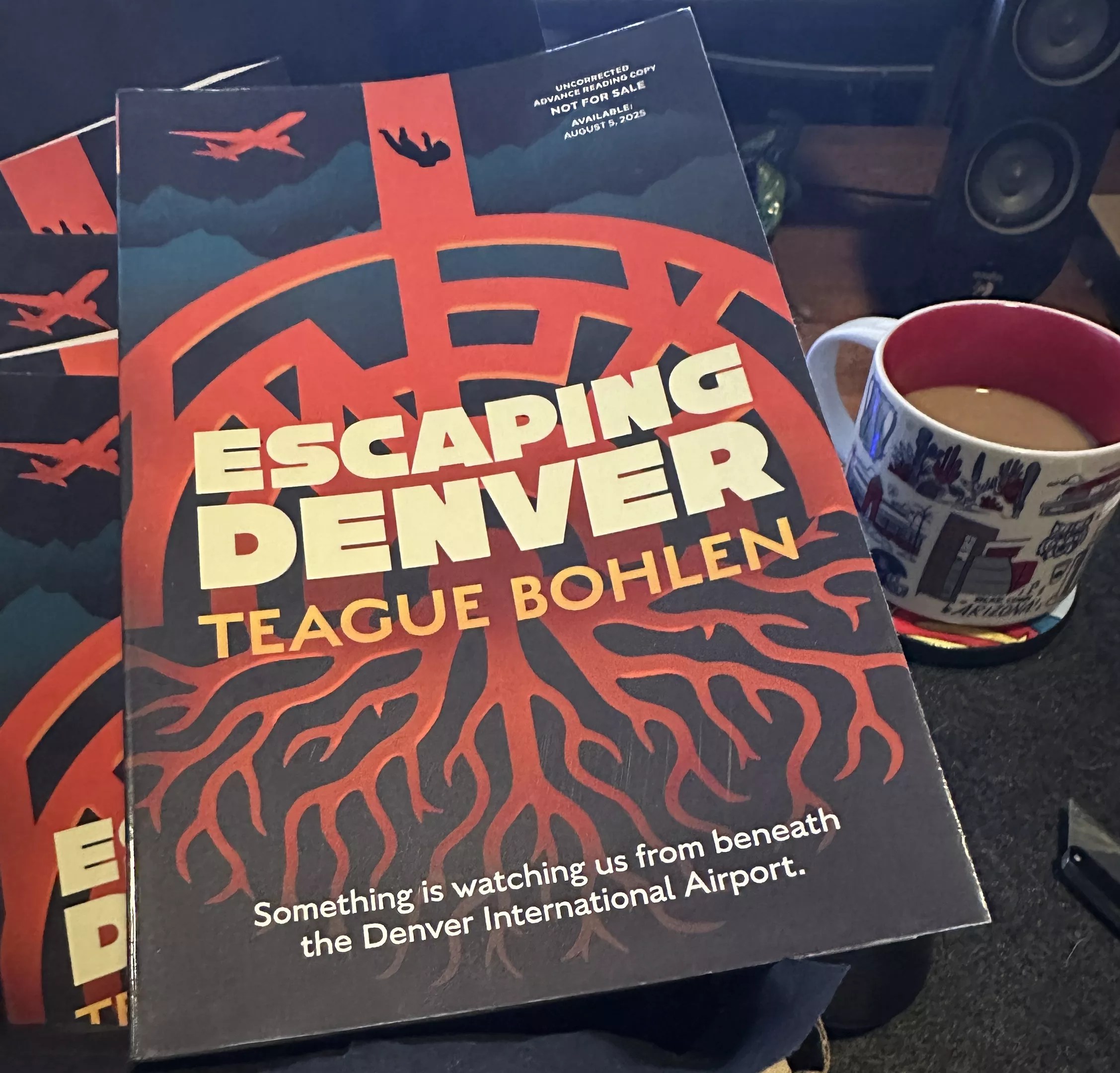 So it’s ironic for a few reasons that I ended up writing a novel called Escaping Denver. Like calling the Queen City of the Plains home for more than a quarter-century and counting, Escaping Denver wasn’t my idea. That honor belongs to a trio of Canadian fellows that I’m glad to call friends these days: Mike Howerun, Brady Roberts and Matthew Hall, who started a podcast about Denver International Airport back in June 2021. Had they even been to DIA? Nope. But they’d seen some YouTube clips about the many conspiracy theories surrounding the Denver airport, and decided that it would be a rocking-good setting for a sci-fi thriller.