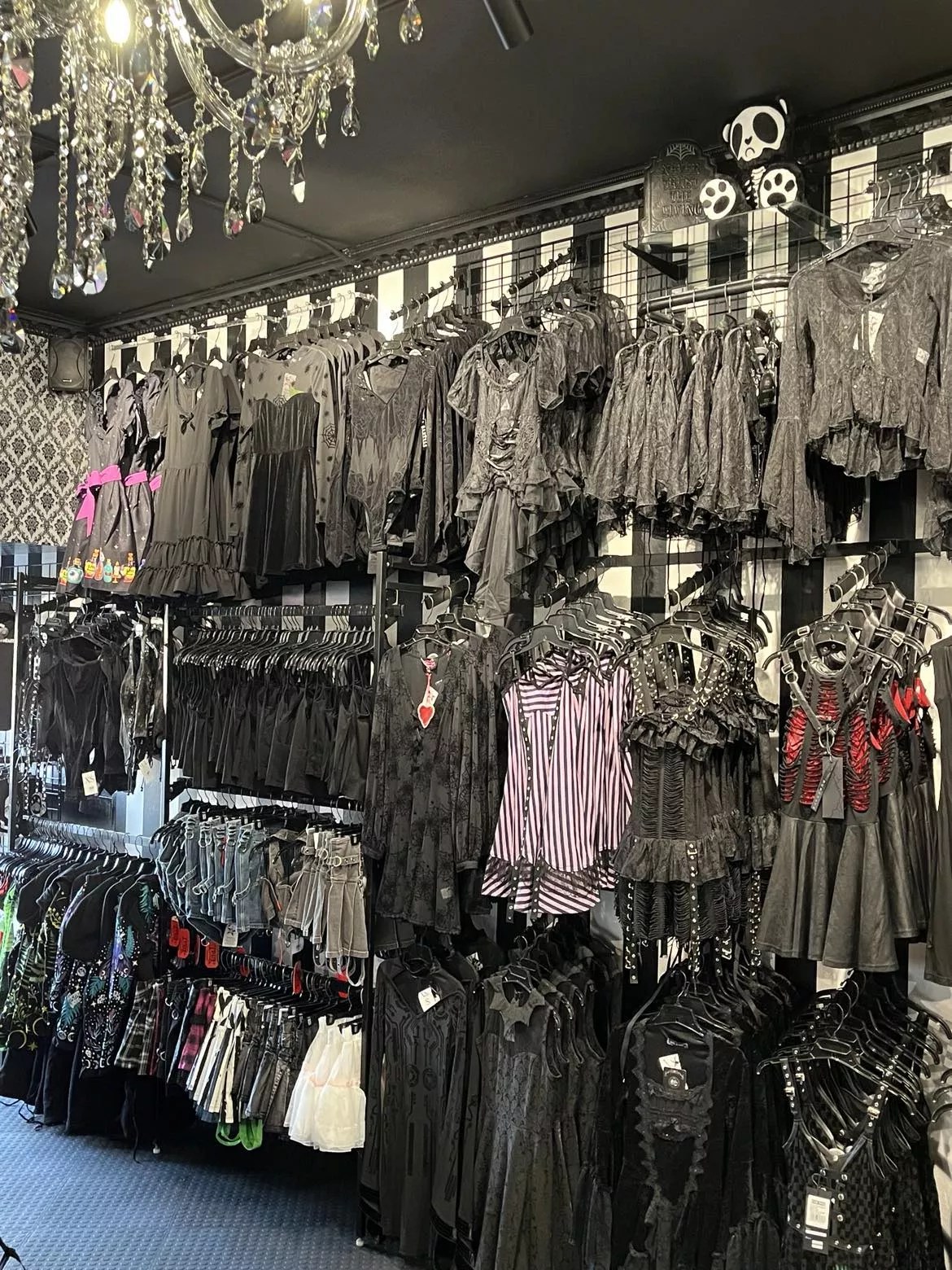 The new store will have many photo opportunities; it practically looks like a selfie museum, with walls featuring Beetlejuice stripes, glitter, spiderwebs and skull brocade wallpaper; buckets of black and pink paint; chandeliers and crown molding. The decor is so professional that they could have brought in an interior designer to get the look. But the Italiano family took on the eight-month renovation themselves, following their fun-loving taste. And it’s documented on their TikTok feed.