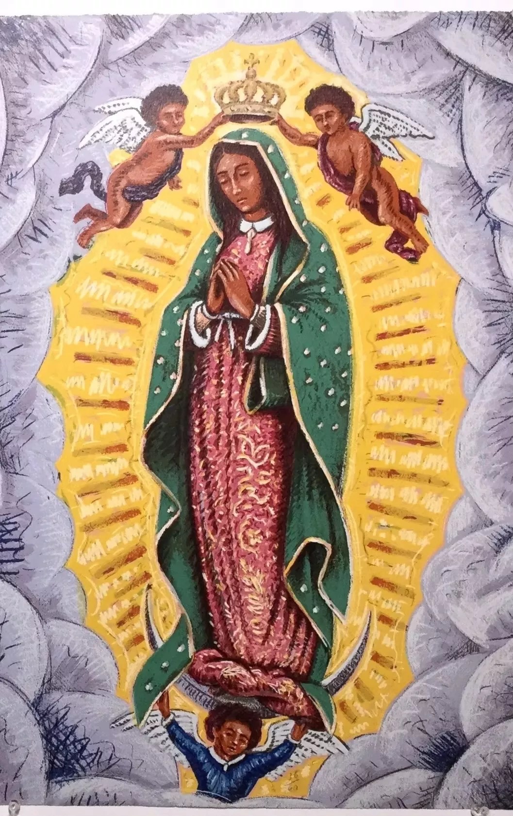 A classic image of La Virgen de Guadalupe by Carlos Santistevan.