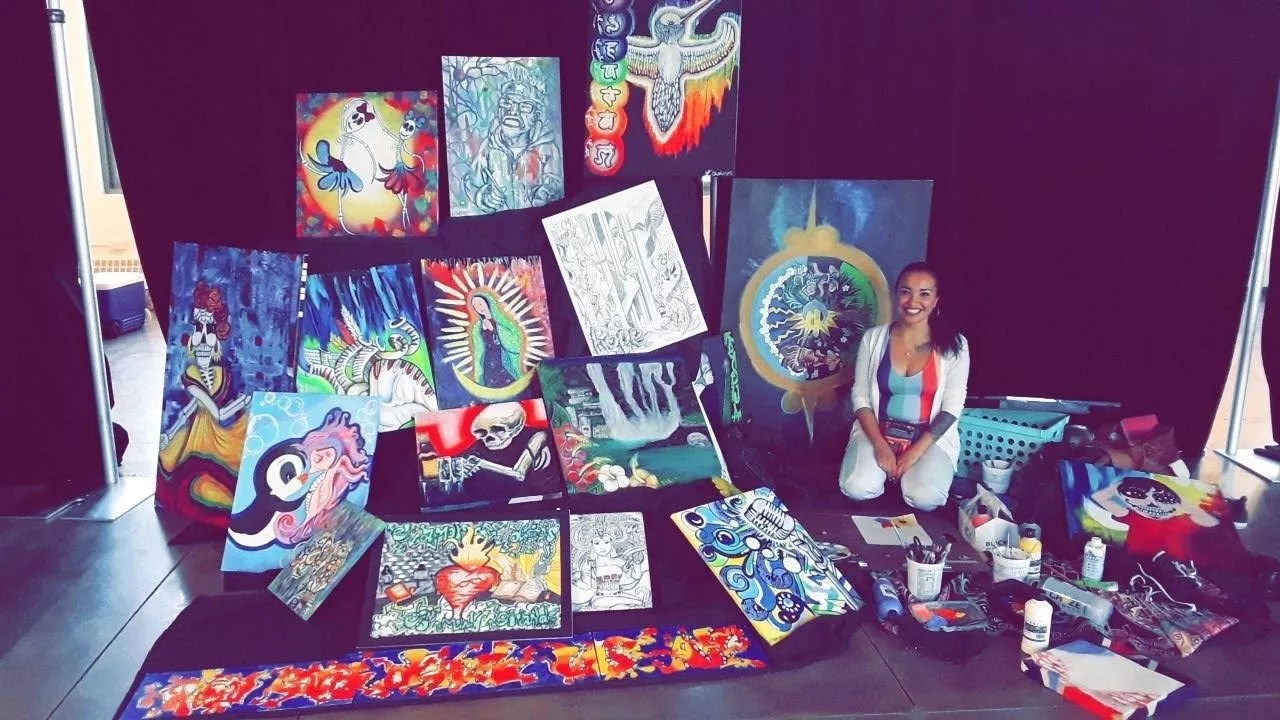 Co-curator Bianca Dominguez, a participant in MSU Denver’s MSU Denver Journey Through Our Heritage program, hangs with the art for Creating Sacred Spaces.