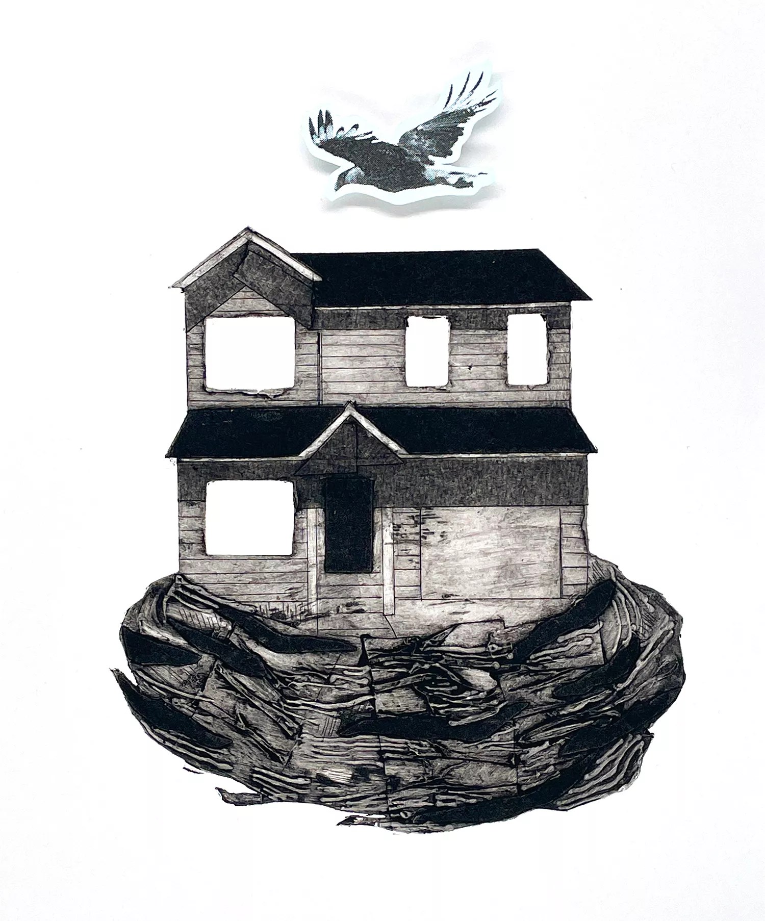 If you often walk through your neighborhood, observing familiar places and unexpected surprises, Brady Smith’s exhibition of screen prints and collagraphs opening at Alto Gallery will feel just like home. Smith calls 5,000 sq. ft., 3 Car Garage a “love letter” to the suburban experience, though its pictures of houses and yards are often printed in commercial-looking halftones that create a feeling of monotony. The show is set up for viewers to follow a path around the gallery, just as you might walk down the sidewalk, turning corners here and there until the halfway mark, where the same images repeat in a backward direction.