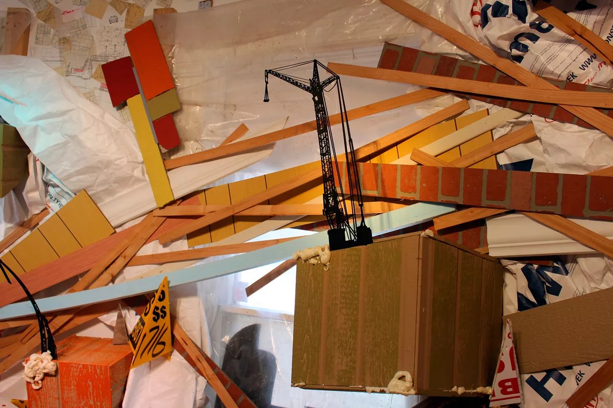 Bonilla uses classic modernism to talk about construction, demolition and the resulting degradation of everyday experience for a city’s residents, and Murphy takes on similar themes in her over-the-top “Fool’s Gold.” She’s used the ubiquitous trash of the new Denver, found-construction debris that litters the landscape and fills the dumpsters of central Denver – such as white sheets of Tyvek and orange-plastic hazard fencing, as well as shards of wood, bits of wallboard and drop cloths – and has draped the materials around the half-circular bay window wall. Peeking out near the center is the classic skyline view of Phillip Johnson’s “cash register building,” partly obscured by the mess in front and around it. That image situates the disaster right here in Denver.