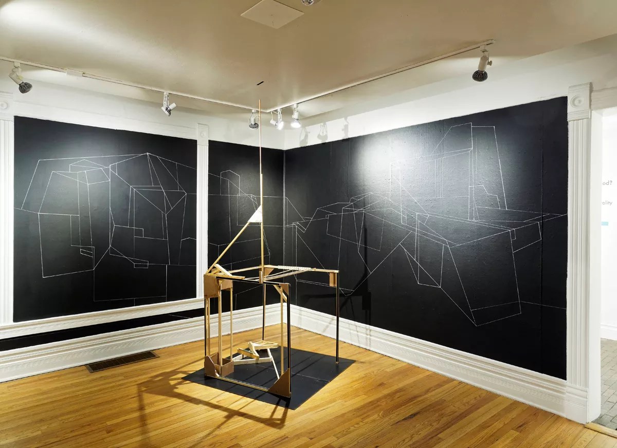 Bonilla was given the first space, which is also the most formal, because it’s part of what was the parish house of the former church that Foothills occupies and still has its Victorian woodwork, now painted white. For the extremely elegant “Kludge City Nice Scenic View,” Bonilla painted the walls a blackboard black and then did geometric constructivist drawings in dashes of chalk white that wrap entirely around the room, creating a continuous composition of transparent architectonic shapes that interlock with one another; the white woodwork, especially around the window that’s been closed off, functions as frames. Though the drawings are suggestive of enclosures, the specific arrangements of lines would sometimes be impossible in three dimensions. The linear illusions of skeletal structures are made real, though, in the wood-frame sculpture set at a diagonal in one of the corners of the room, where Bonilla has built an outline of a partial cube on a black-painted flat plane laid on the floor. There’s the suggestion of a pyramidal roof capped by a spire, with its missing elements filled in by the viewer’s imagination. The piece also features a boxy wooden contraption with a speaker playing a digital voice reading negative Yelp reviews of a building where Bonilla once lived.