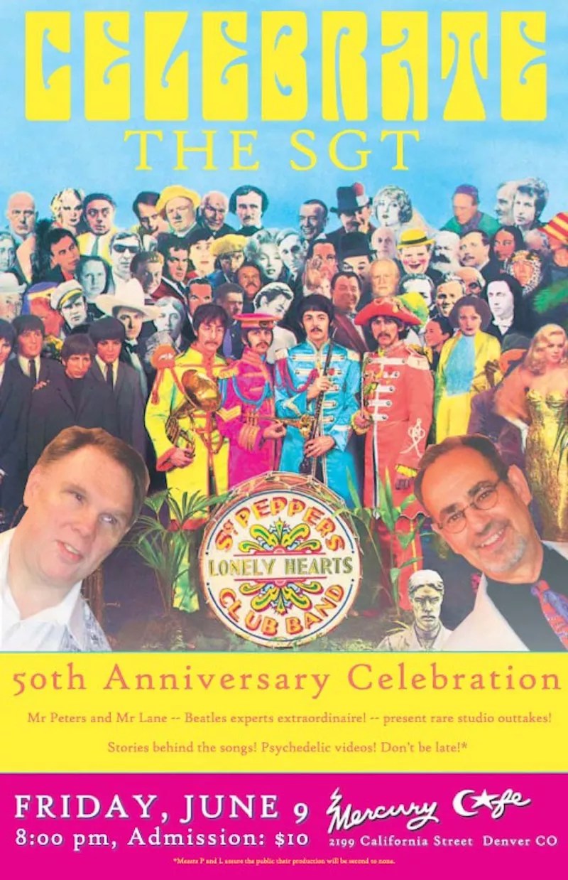 Beatles maniacs, unite! It’s been fifty years since the four Liverpool lads gathered to record their eighth studio album, signaling a bold new direction for the band. An instant classic upon release, Sgt. Pepper’s Lonely Hearts Club Band has only grown in esteem in the intervening years, to the point that it’s widely considered the best rock album ever recorded. Celebrate the Mile High way with local staple the Mercury Cafe as it invites Beatles experts Mr. Peters and Mr. Lane for a poppy production full of rare studio outtakes, behind-the-scenes stories and plenty of psychedelic videos. Tickets, $10, are available at the door. Visit mercurycafe.com to learn more.