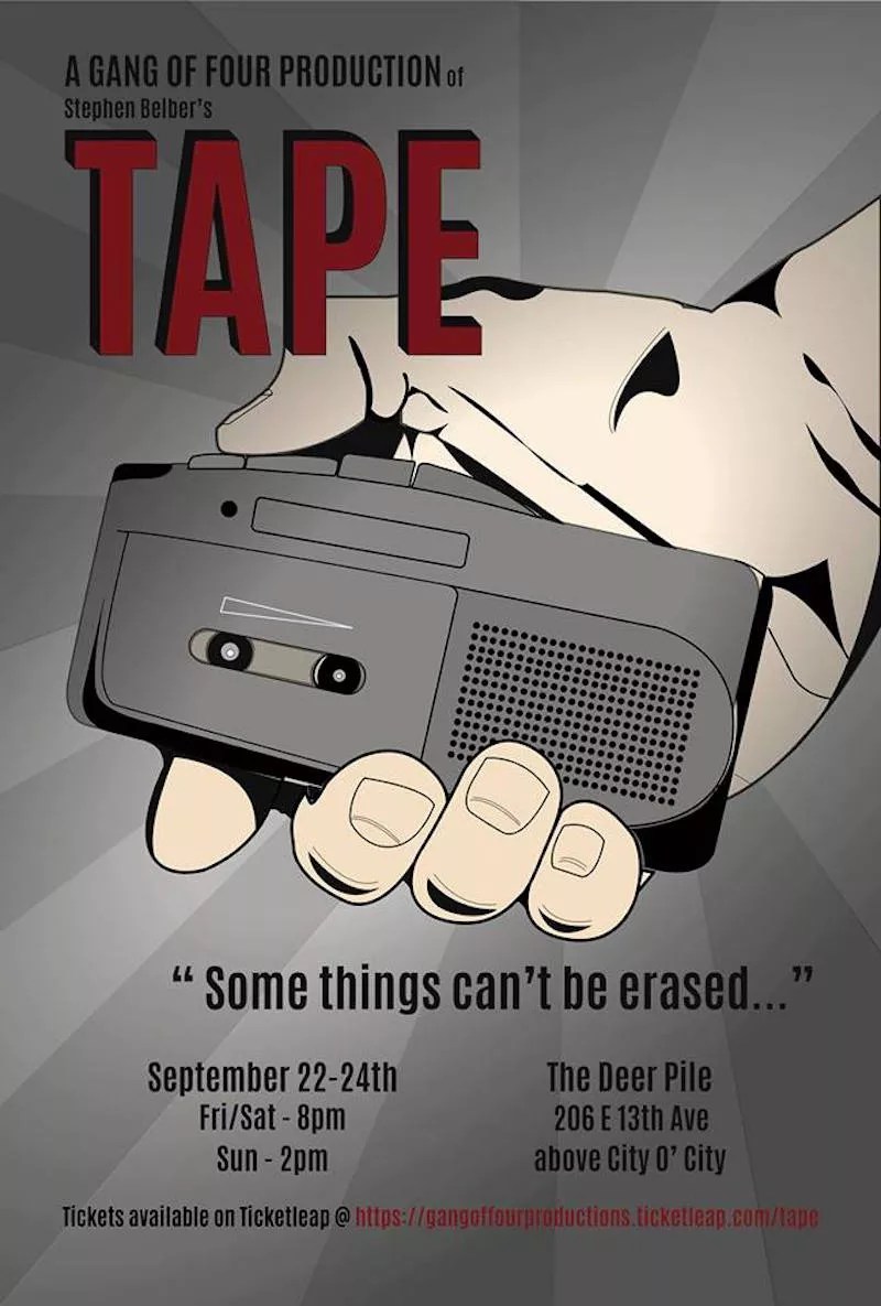 A harrowing tale of jealousy poisoning an old friendship, Stephen Belber’s TAPE balances pot-boiling suspense with the intimacy of a diary journal. Previously adapted by Richard Linklater into a motion picture starring Ethan Hawke and Uma Thurman, the play tells the story of an on-the-rise filmmaker meeting up with his high school buddy prior to a career-making screening, only to have old entanglements tear their bond asunder. Mounted by local theater troupe Gang of Four Productions, this version of TAPE has found a fitting home for its claustrophobic chamber drama at local DIY arts space the Deer Pile, which will host evening and matinee performances. Learn more and buy tickets, $5, from Gang of Productions online.