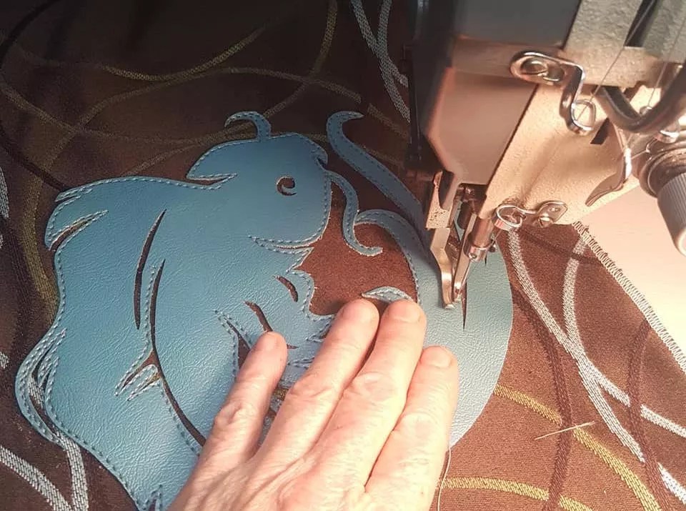 Jill Mustoffa stitching up a retro fabric collage.