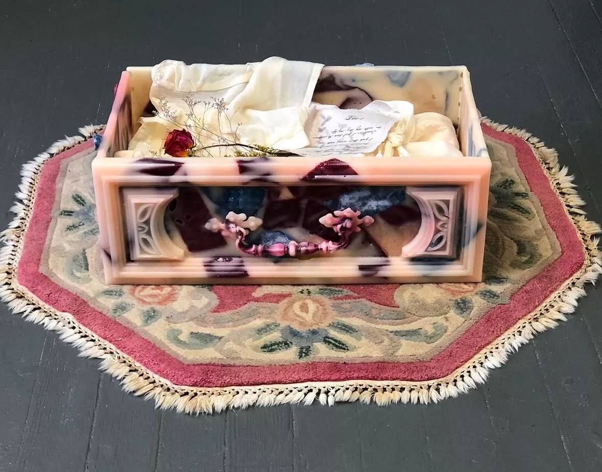 “There’s a beeswax mold of a dresser drawer that touches on the early 1800s when women would collect things for a death drawer — all these things that they wanted to be remembered for after they died,” McIntosh says. “I think women do that even now.”