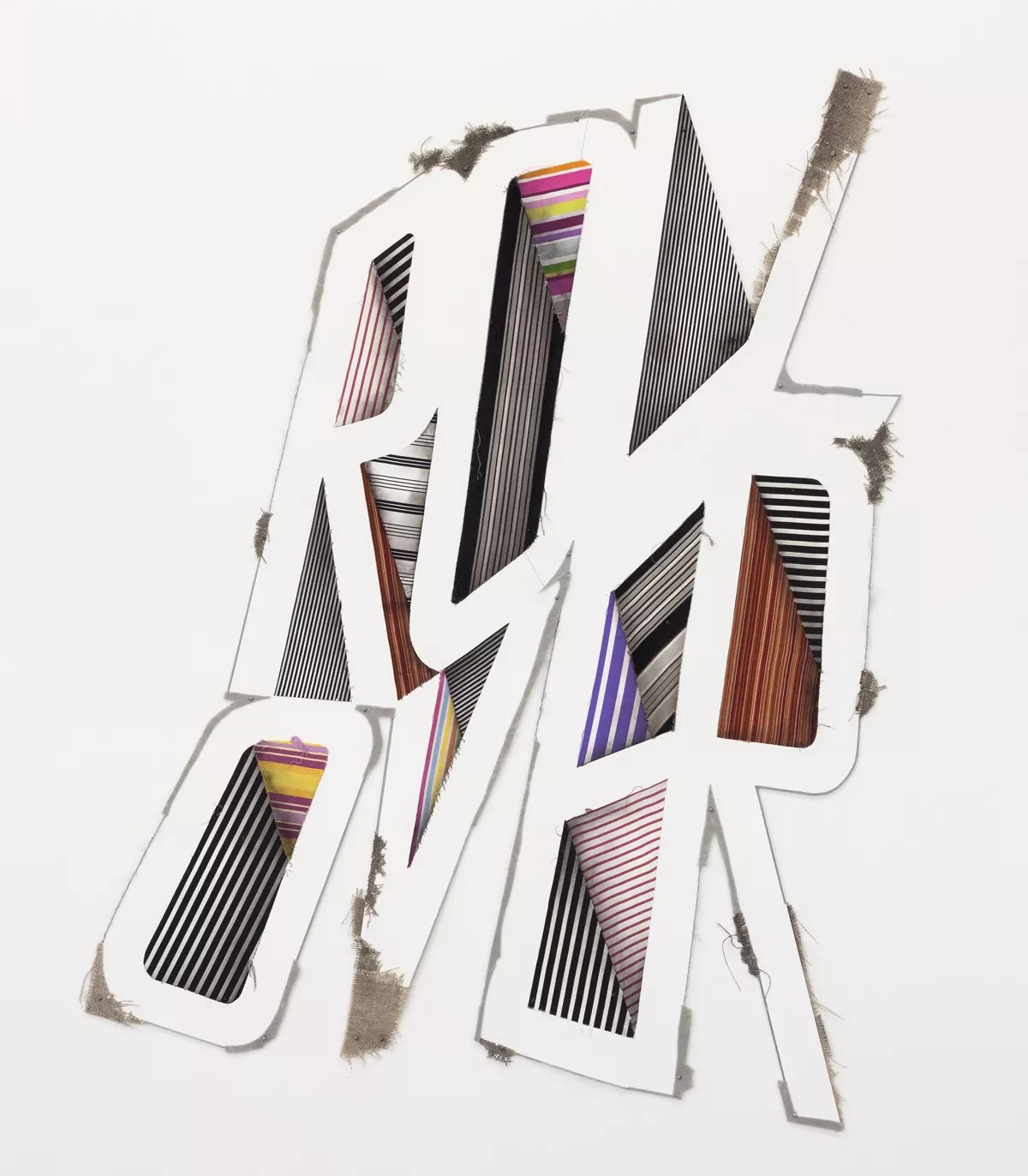 Herritt introduces a dynamic juxtaposition in these works: the contrast between the suggestion of control in the commands themselves and the lack of control represented by the flowing watercolors in the works on paper, or the imprecision of the torn fabrics in the wall installations.