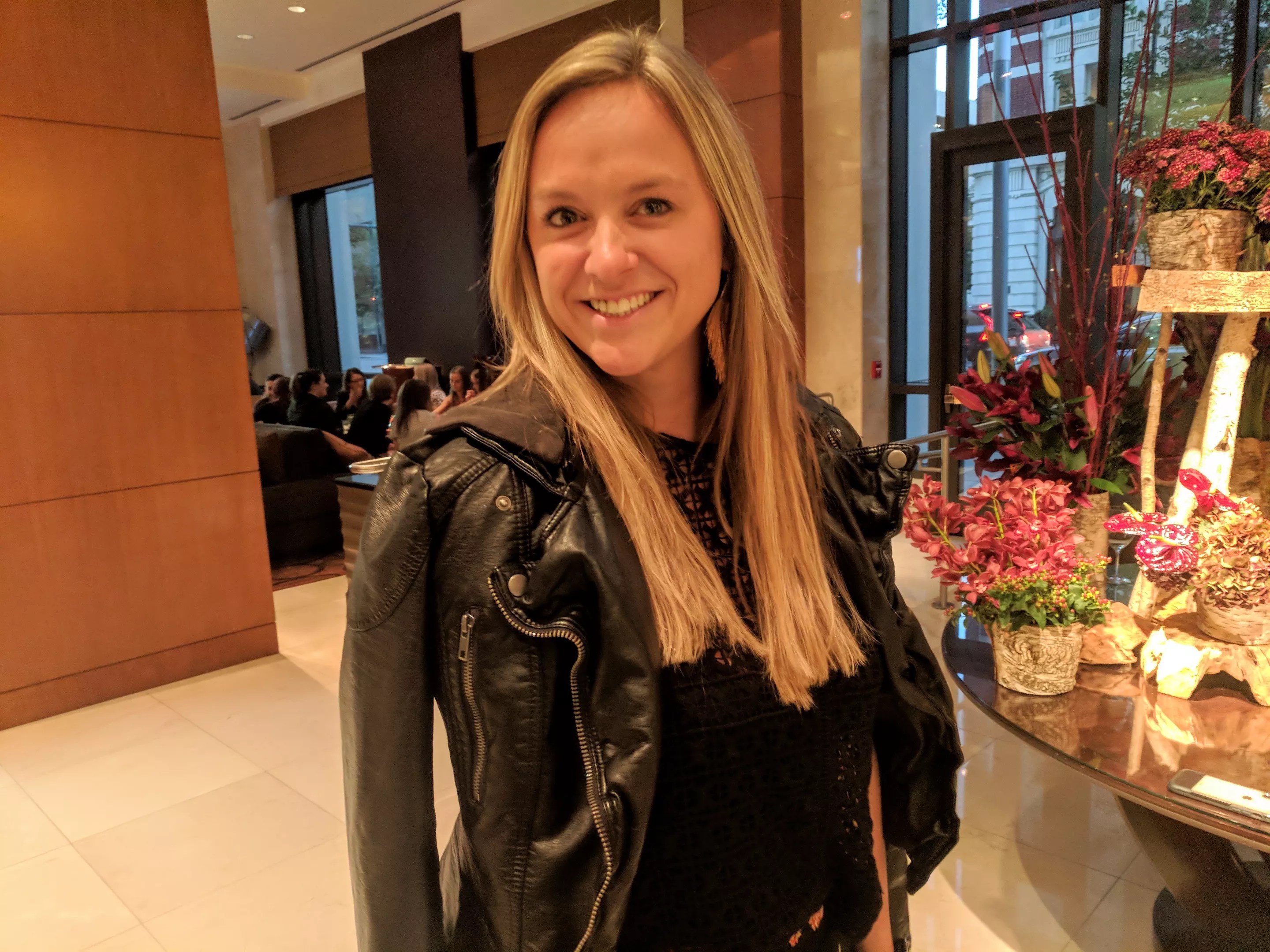 Co-owner Grace Buttorff wore a black leather jacket with a zippered hood by Free People. She styled it off the shoulder, just as her models walking the runway did. “It’s a great piece because you don’t have to do the layering; the jacket does it for you,” she said. “It’s also super-soft and it’s super reasonably priced, like $130. It’s impossible to find a double-layered leather jacket for that price.”