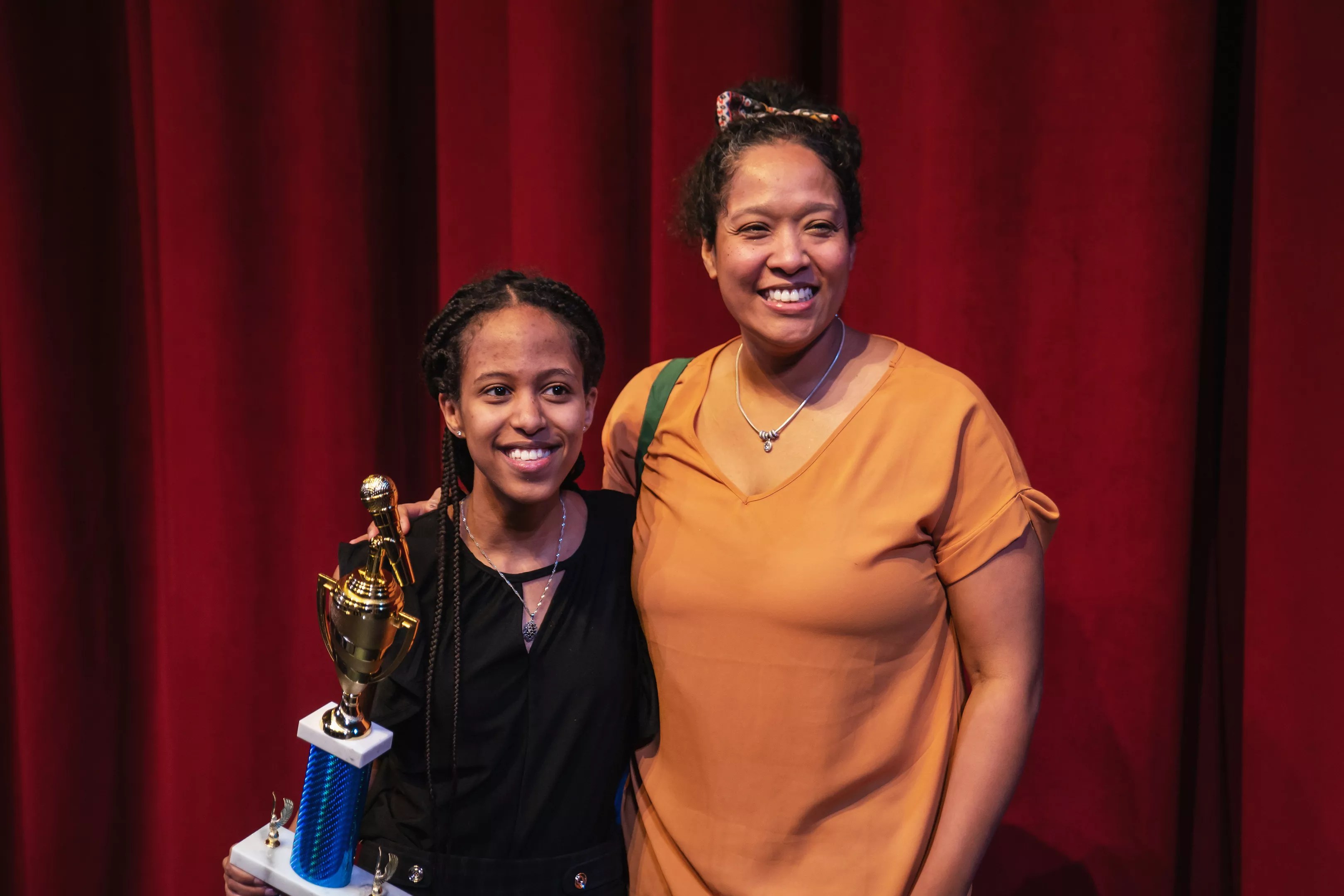 Hana Kebede poses with her coach, Pam Ford, after winning Colorado’s Poetry Out Loud competition on March 1.