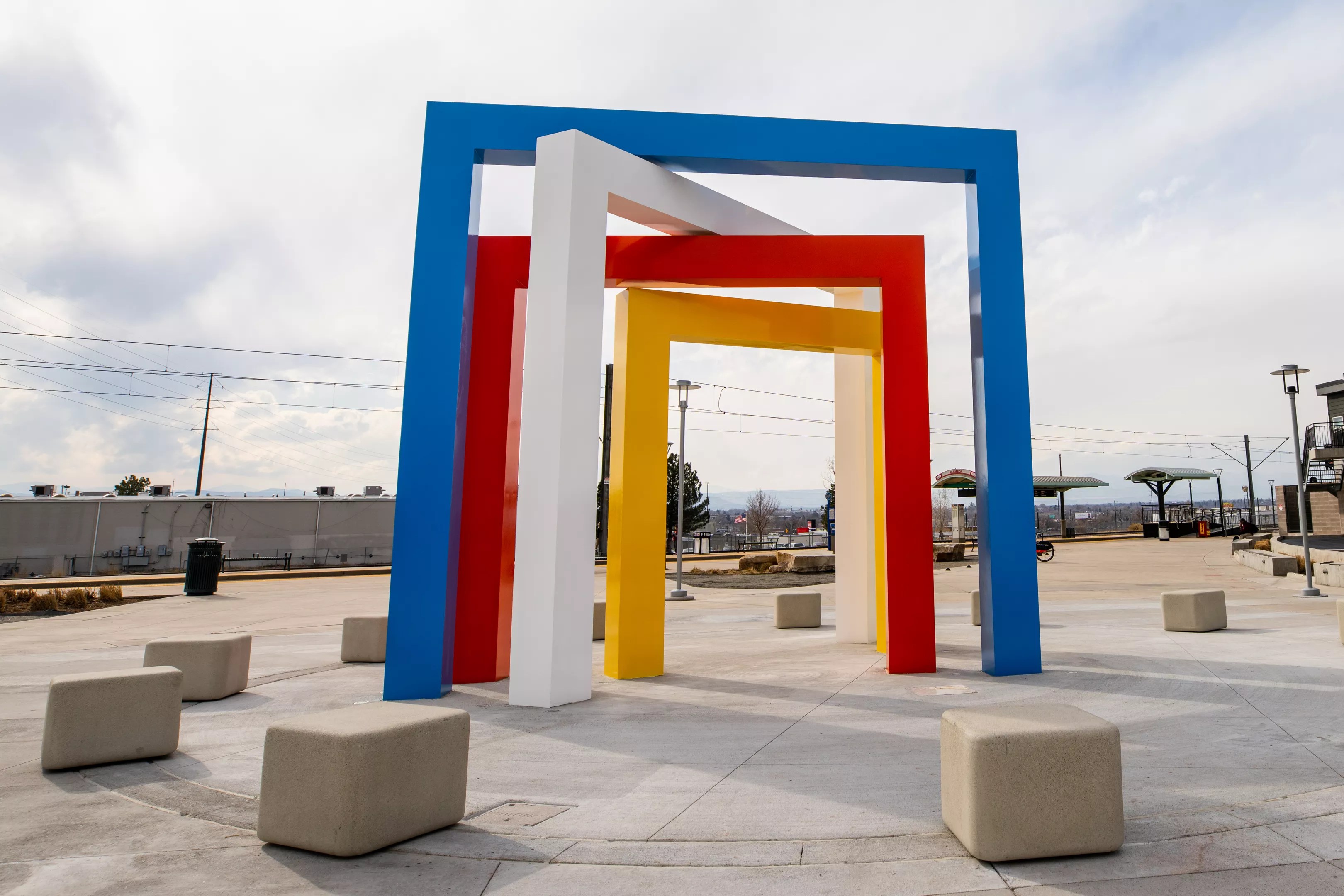 “Four Chromatic Gates” is located at the Alameda Light Rail Station at 425 South Cherokee Street.