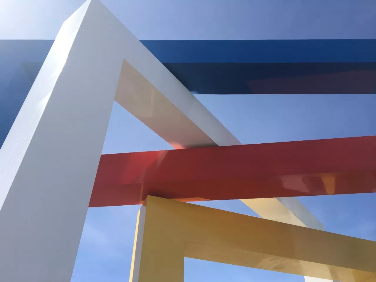 The choice of these colors, which are the primaries plus white, harks back to Bayer’s Bauhaus days, wherein art was reduced to its most basic features – and in this case, its most basic colors. A similar reduction is seen formally, in which only straight horizontals and verticals are used by Bayer to build the visual language of the sculpture, with the interaction of the components creating intrigue.