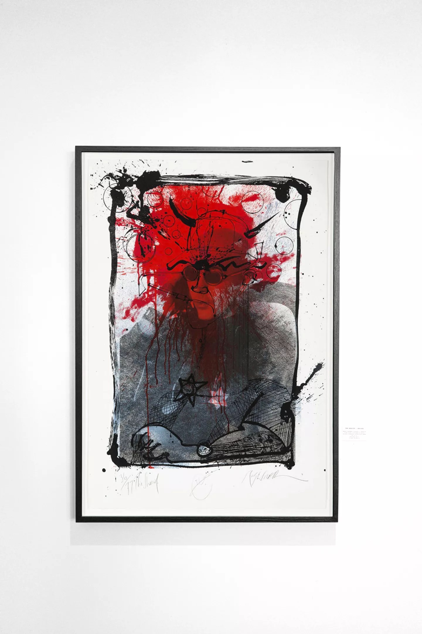 The exhibit also includes photographs of Thompson taken by Hiser during the former’s run for office. The photographs were then illustrated by Steadman, using his chaotic scribble technique that evokes blood splatter. Then there’s the original “Dr. Gonzo” drawing by Steadman that will be recognizable to anyone familiar with Fear and Loathing in Las Vegas. And there’s a framed fax from Thompson with a doodle and a quote, showing his initial refusal to collaborate with Steadman – a partnership that was assigned by a third party and eventually worked out beautifully.