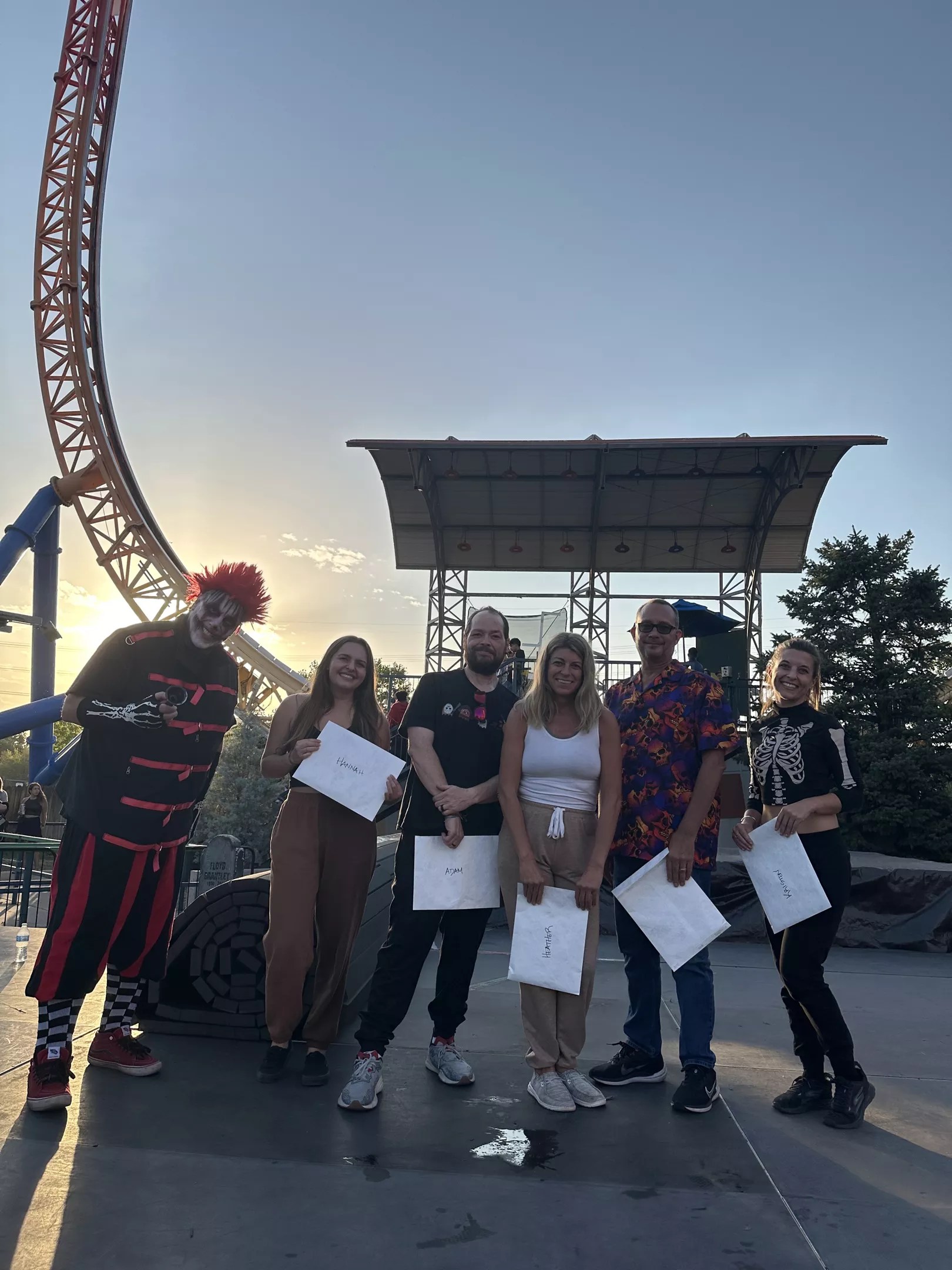 24 hours later, the coffin dwellers pose with their rewards: two Elitch Gardens 2025 season passes, two 2025 premium dining plans and two 2024 Fright Fest X-Scream and admission passes.