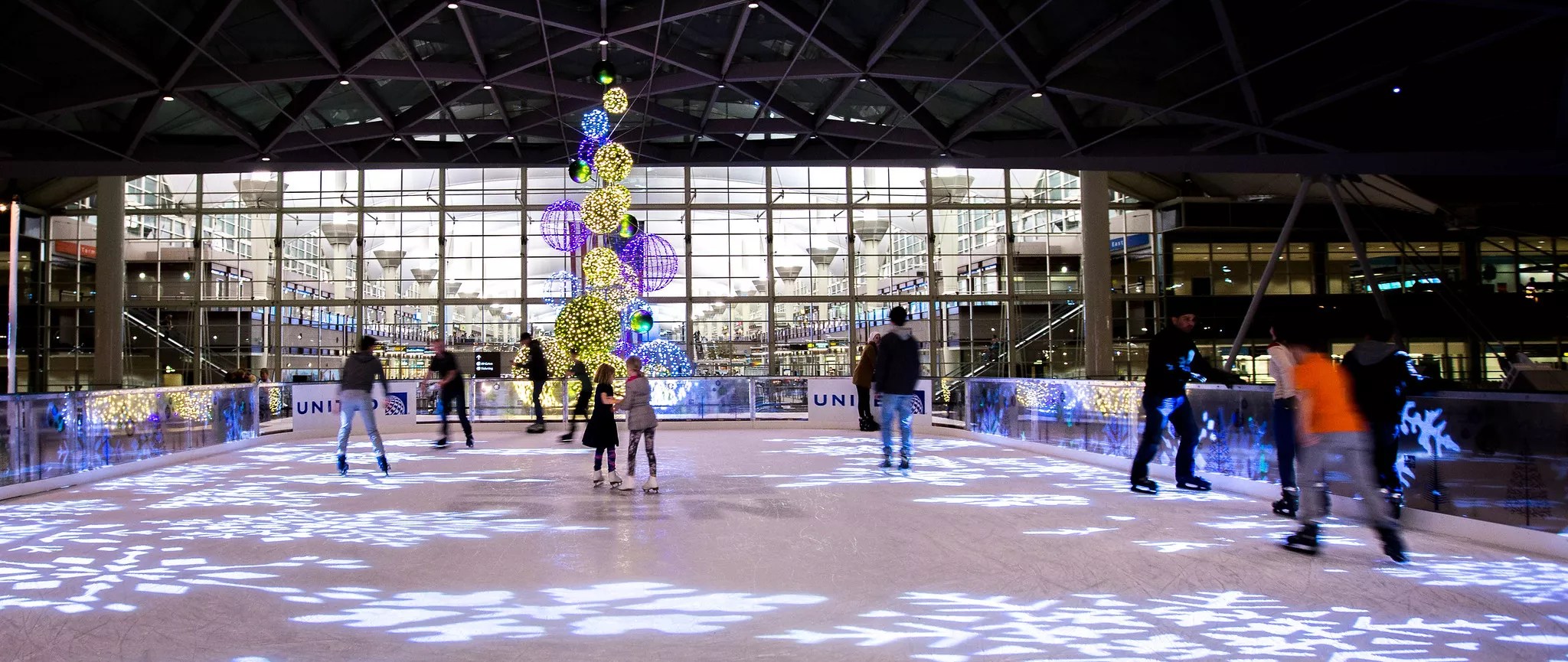 If you want to skate, this is the best deal in town – though admittedly not the most convenient. For the fourth year, the airport is hosting a skating rink on the plaza outside the terminal. It’s open daily, and skating is not only free, but skates are provided at no charge. Find out more here.