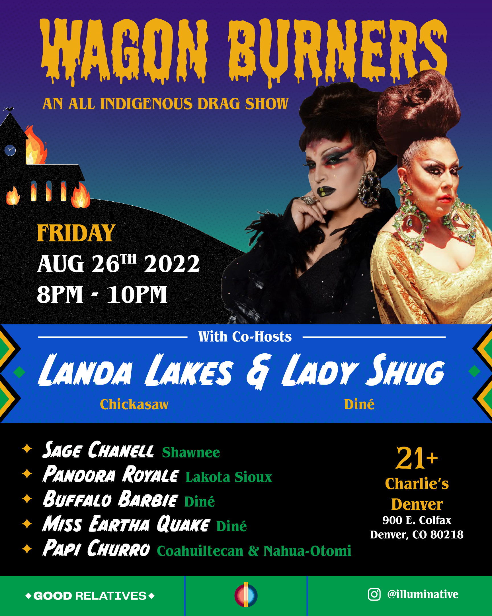 Wagon Burners will be co-hosted by Landa Lakes (of the Chickasaw tribe) and Lady Shug (Diné), and include performances from Sage Chanell (Shwanee), Pandora Royale (Lakota Sioux), Papi Churro (Coahuiltecan and Nahua-Otomi), Buffalo Barbie (Diné) and Miss Eartha Quake. In addition to highlighting the individuality among Indigenous drag artists, the Wagon Burners show is also a way for IllumiNative to unite Native peoples of all identities across the Denver metro area, which was originally home to the Sioux, Cheyenne, Arapaho and Ute tribes before colonization.