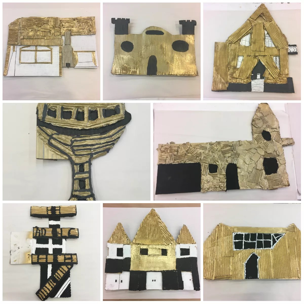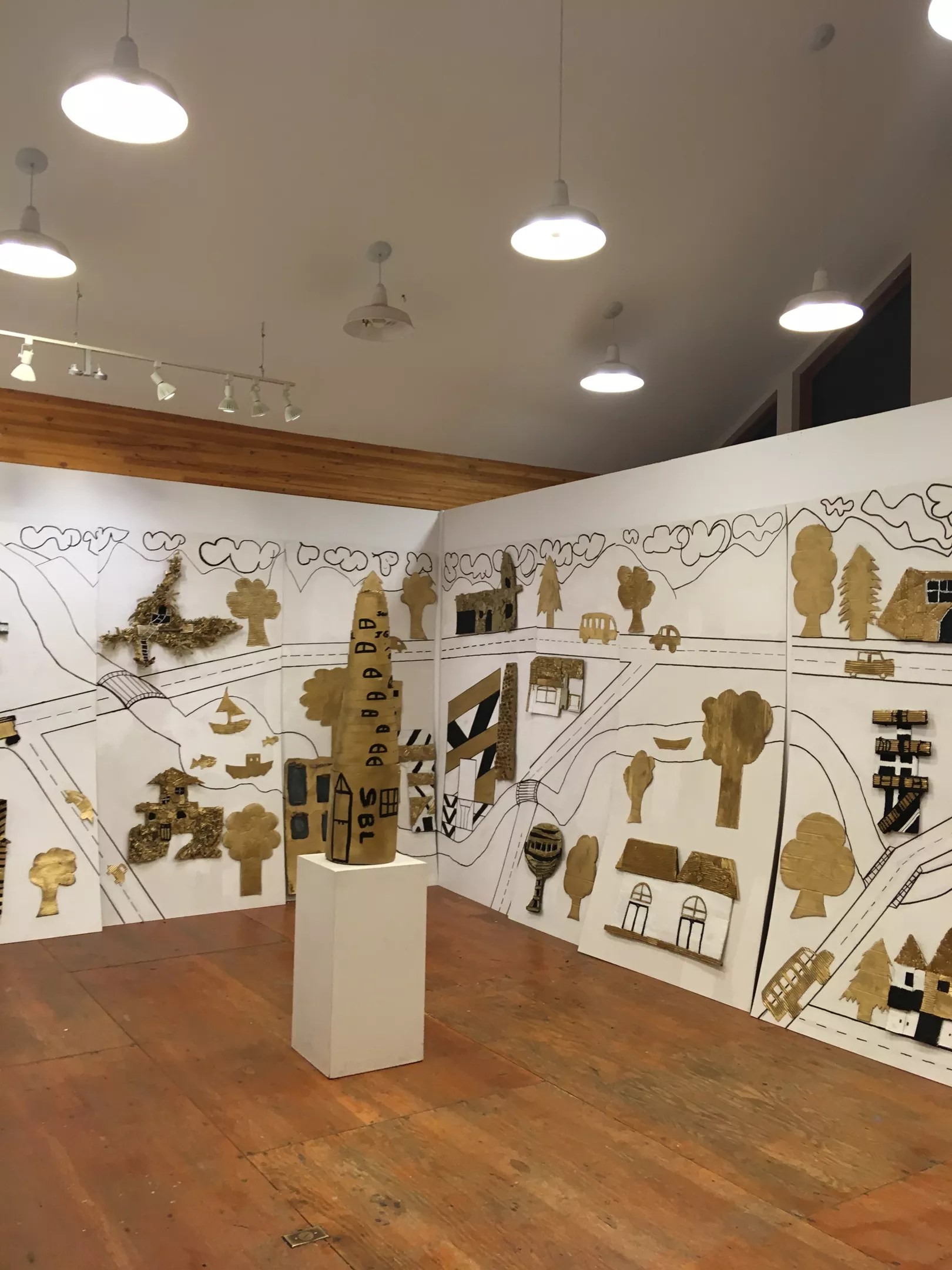 Students started working on September 18 and will finish up before a gallery opening on November 10; the show will run through December 22. Collectively, the group designed the town for the mural and decided to use cardboard with gold, black and white paint for the houses. Also as a group, they’ve been working on answering a question: How do we know when we’re home?
