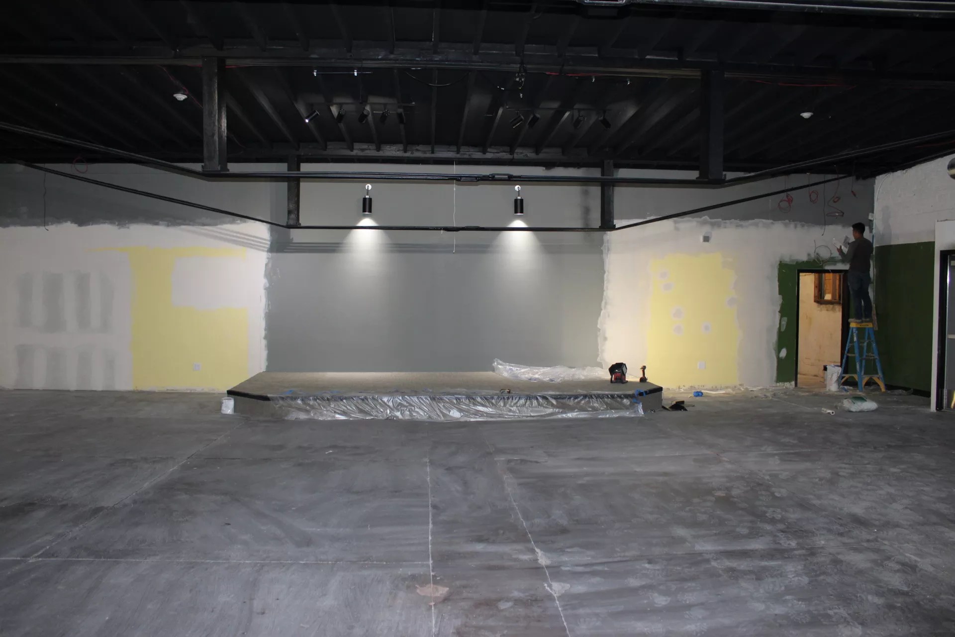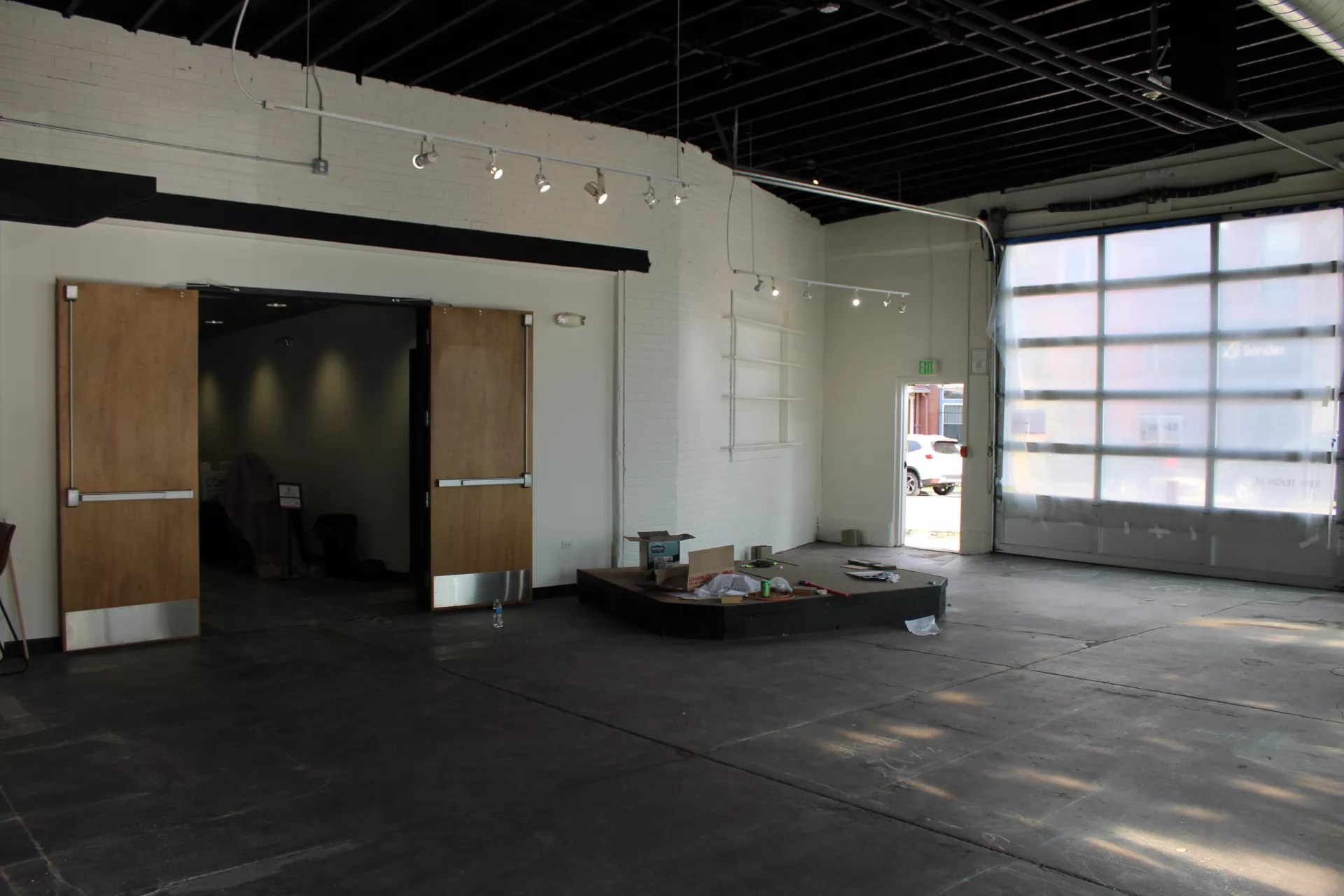 “This is our performance space. Three hundred people capacity,” Tobey says. “You’re not hallucinating: This thing slopes, and we’re being very transparent about that. From the front west side to the east side, she slopes. Changing this space is tricky due to the current zoning, but for a theater, this is beautiful. If this was flat, we’d be screwed, but it’s a slope, and it’s beautiful. It serves our purpose amazingly.”