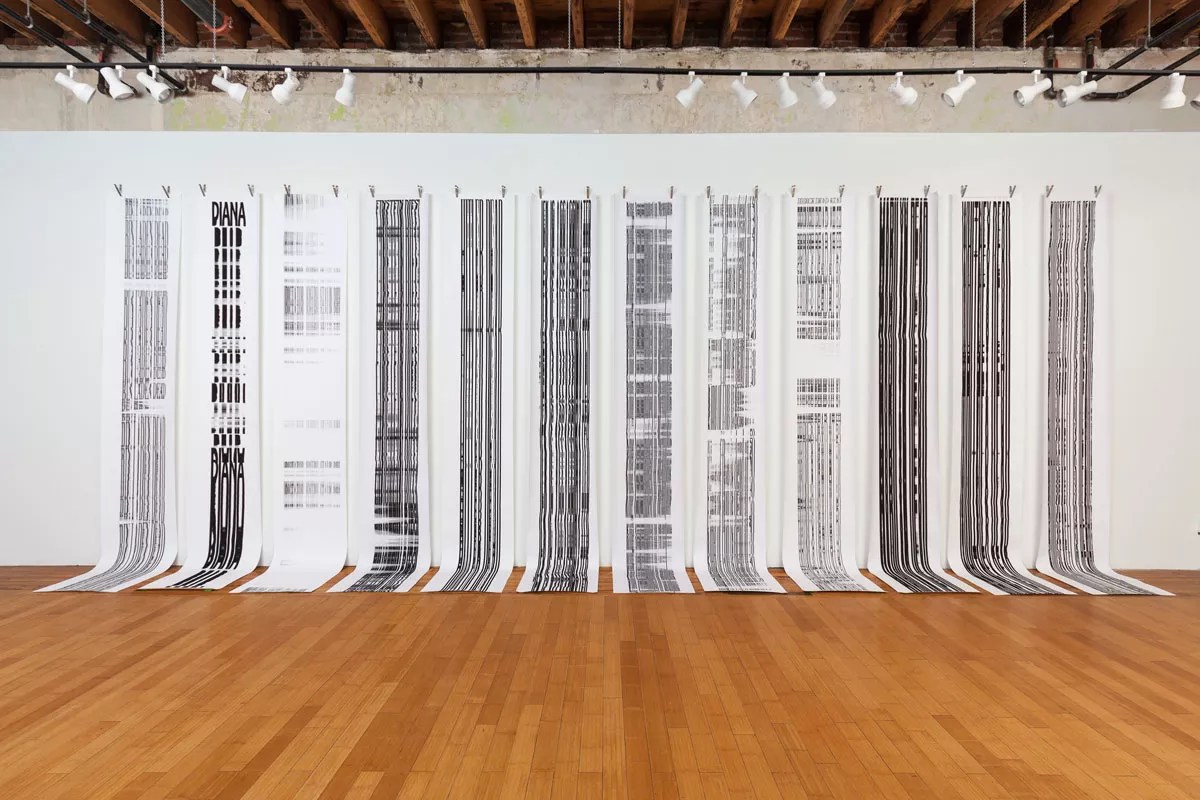 Other pieces are more enigmatic. For the three-part “Marginalized Ways of Speaking,” Swanson created written expressions of lisping, mumbling and stuttering by covering sheets of paper with repeated lines of black vinyl label tape that spell out these ordinarily aural experiences. A few of the works seem to have personal content, which is unusual for an artist interested in conveying the universal. A pair of plastic swirls are 3D-printed renditions of the audio of his parents saying “sticks and stones,” providing the exhibit’s title piece. The striking photo-mural “Soda Lid” shows a familiar plastic drink lid from a convenience store; by zeroing in on the raised dimple labeled “other,” Swanson makes an existential statement.