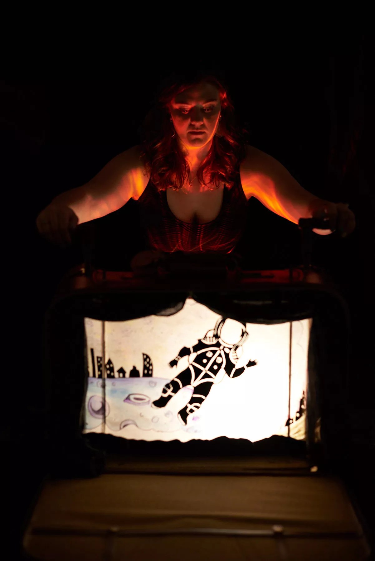 Williams puppeteering her “crankie” (a moving backdrop used in shadow puppetry) for Erik Fellenstein’s original song “Jack and the Apocalyptic Moon Journey.”