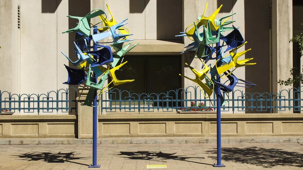 Located outside the Federal Reserve Bank on Curtis Street, between 16th and 17th streets through October 1, “Future Seat” comprises two sculptures – each ten feet tall and five feet wide – that loosely resemble the growing trees lining downtown blocks; chairs sprawl out in all directions from the blue poles like leaves and branches.