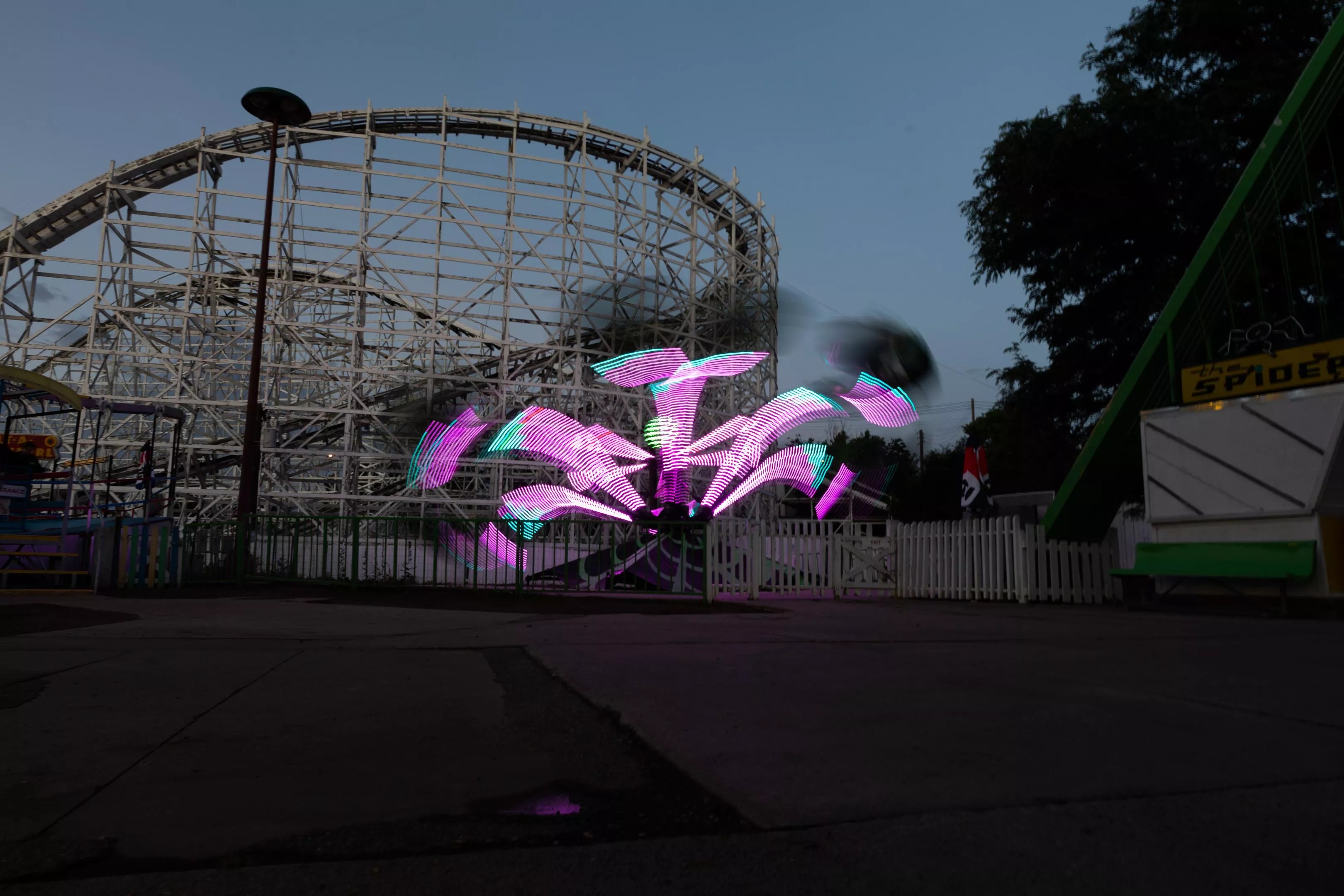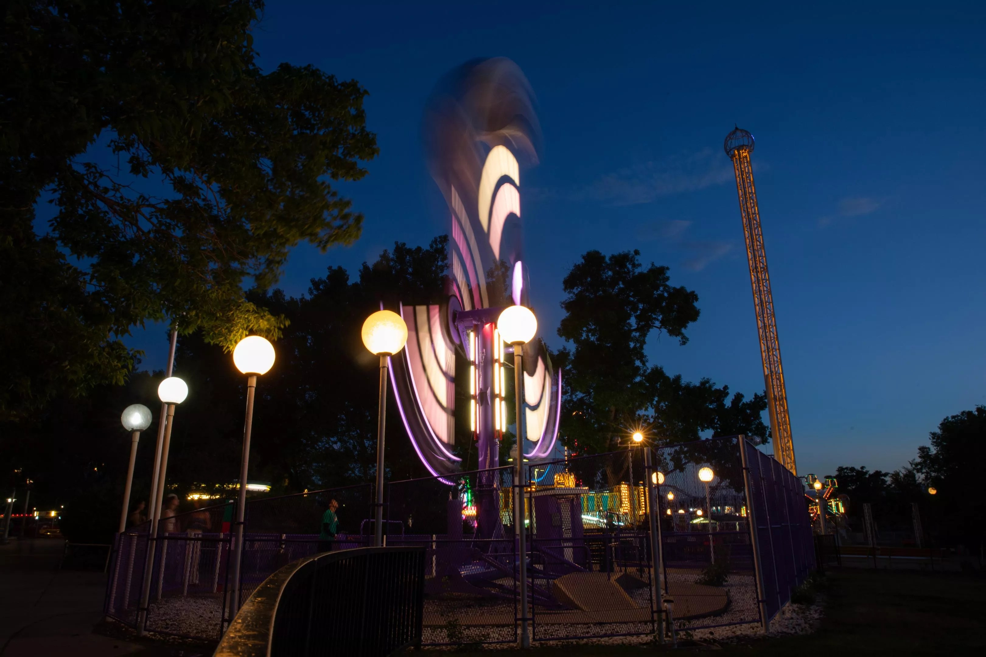 While the lights are on at both rides, Roll-O-Plane (left) flies, while Zoom sits idle.