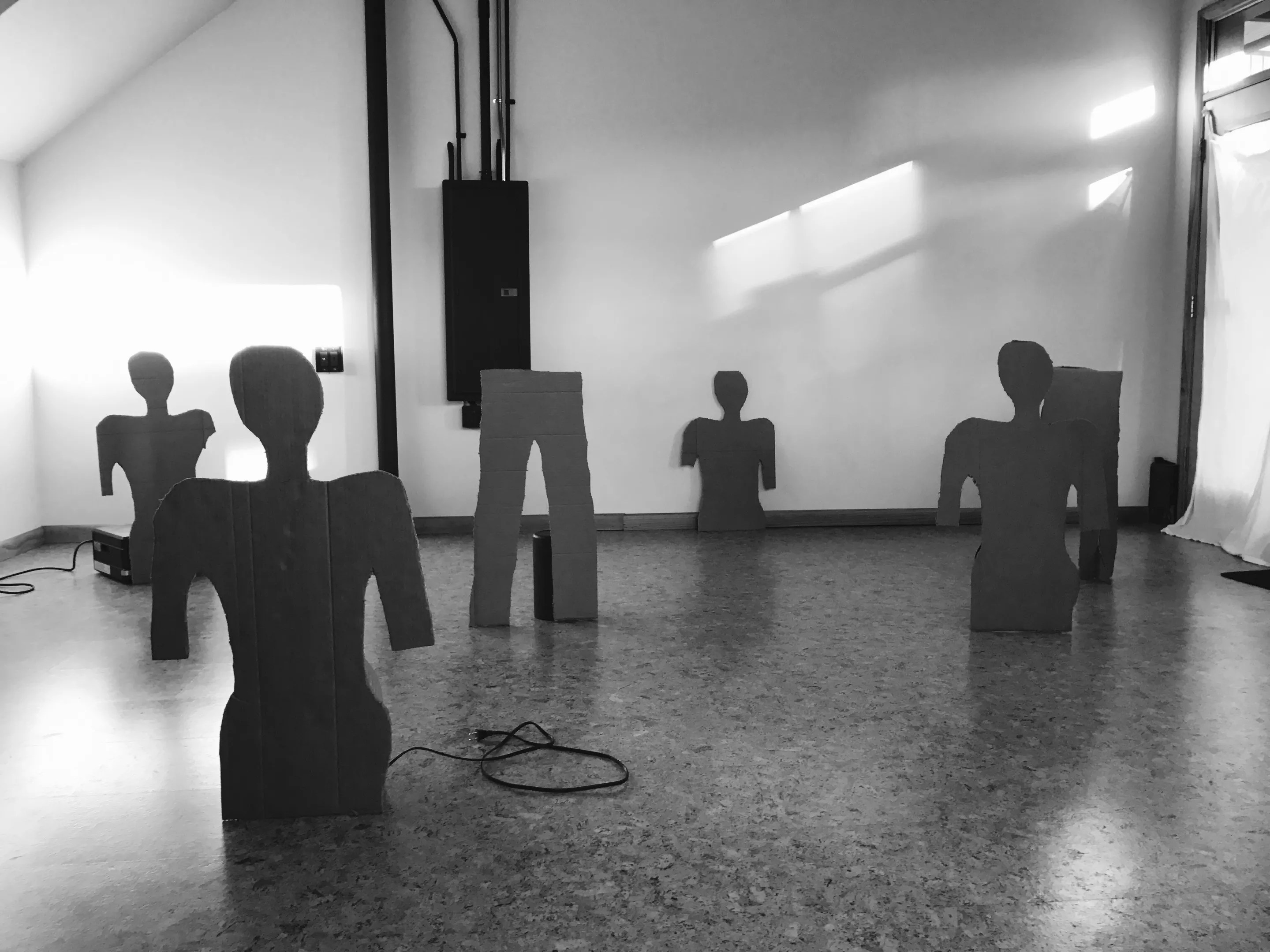 All of my work deals with relationships, and I notice that more than ever when I work solo. The relationships between myself and the space, the objects in the space, the architecture and the audience are almost magnified in solo work. This piece is no exception. Also, the space is covered with cardboard cutouts of people, so it feels like a solo that is posing as a large ensemble piece. Or maybe it is a large ensemble piece posing as a solo. I think I’m trying to complicate what a solo is.