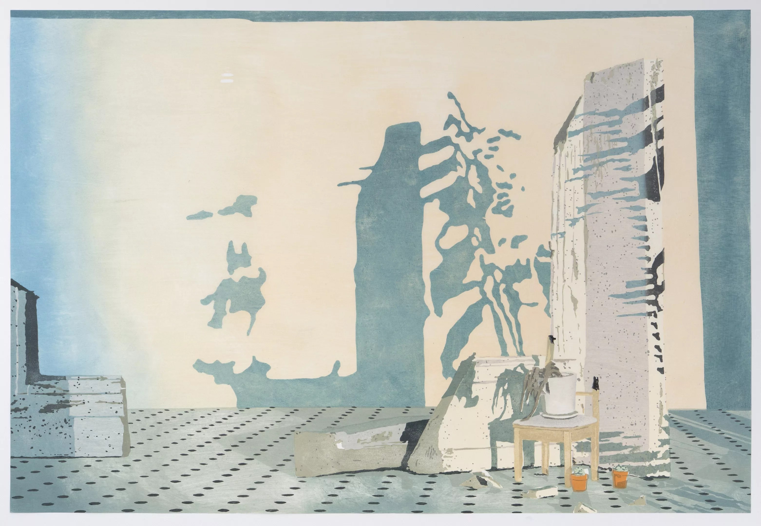 The little installation elements are really neat, and the photos are great, especially in the way that Frances catches the artificial yet natural-looking light. But the stunning prints are the greatest achievement. Done with multiple woodblocks, inked in different colors, at first glance they click into an almost photographic realism, their textural and expressive qualities only visible when more closely examined. That’s the case with “In the Headlights,” a woodblock print that shows what looks like a wrecked room, with a partially burnt chair, a dead plant on top of it, set on a white floor dotted with black, surrounded by ruined walls. The illusion of the projected light of the title is the gigantic plant shadows cast on the back wall. Even more realistic, and using most of the same elements with another big projected shadow at the back, is “You know, I didn’t like it, so I broke it.”
