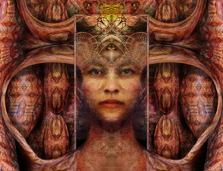 Carlos Frésquez, whom Salazar describes as “one of the most renowned Chicanos in the state and nationally,” has printed fifteen digital photographs representing Malinche that he’s pasted like “Wanted” posters, illustrating how she was criminalized. Quintin Gonzalez also went the tech route, with three stunning digital paintings of Malinche that depict her as a psychedelic goddess dripping with fractals, which emphasize her widespread impact on world history.